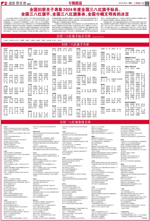 全國婦聯(lián)關(guān)于表彰2024年度全國三八紅旗手標(biāo)兵、全國三八紅旗手、全國三八紅旗集體、全國巾幗文明崗的決定