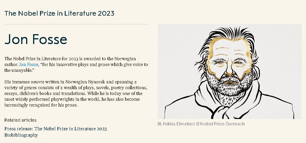 2023 年諾貝爾文學(xué)獎授予挪威作家喬恩·福斯,“表彰他的創(chuàng)新戲劇和散文,為難以言喻的事物發(fā)聲?!彼门餐嶂Z斯克語寫成的巨著涵蓋多種體裁,包括豐富的戲劇、小說、詩集、散文、兒童讀物和翻譯作品。雖然他如今是世界上演出最廣泛的劇作家之一,但他的散文也越來越受到認可。