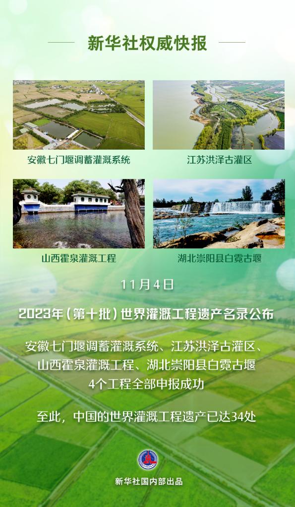 新華社北京11月4日電(記者劉詩平、陳冬書)安徽七門堰調蓄灌溉系統(tǒng)、江蘇洪澤古灌區(qū)、山西霍泉灌溉工程、湖北崇陽縣白霓古堰4日成功入選2023年(第十批)世界灌溉工程遺產(chǎn)名錄。至此,我國的世界灌溉工程遺產(chǎn)達到34處。