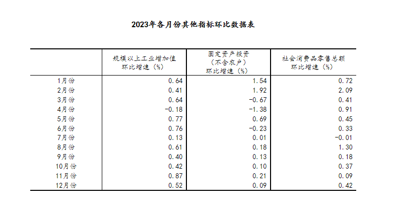 (2)根據(jù)季節(jié)調(diào)整模型自動(dòng)修正結(jié)果,對(duì)近一年來(lái)各期國(guó)內(nèi)生產(chǎn)總值、規(guī)模以上工業(yè)增加值、固定資產(chǎn)投資(不含農(nóng)戶)、社會(huì)消費(fèi)品零售總額環(huán)比增速進(jìn)行修訂。修訂結(jié)果及2023年四季度GDP環(huán)比數(shù)據(jù)、2023年12月份其他指標(biāo)環(huán)比數(shù)據(jù)如下: