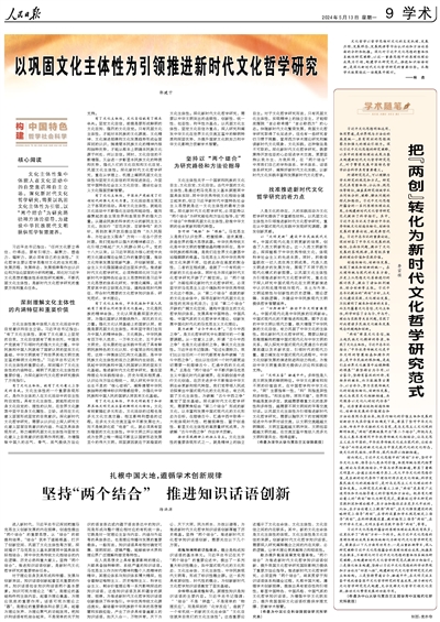 文化主體性集中體現(xiàn)人在文化活動(dòng)中的自覺意識(shí)和自主立場(chǎng)。深化新時(shí)代文化哲學(xué)研究,需要以鞏固文化主體性為引領(lǐng),以“兩個(gè)結(jié)合”為研究路徑和方法論指導(dǎo),為建設(shè)中華民族現(xiàn)代文明提供哲學(xué)智慧滋養(yǎng)。