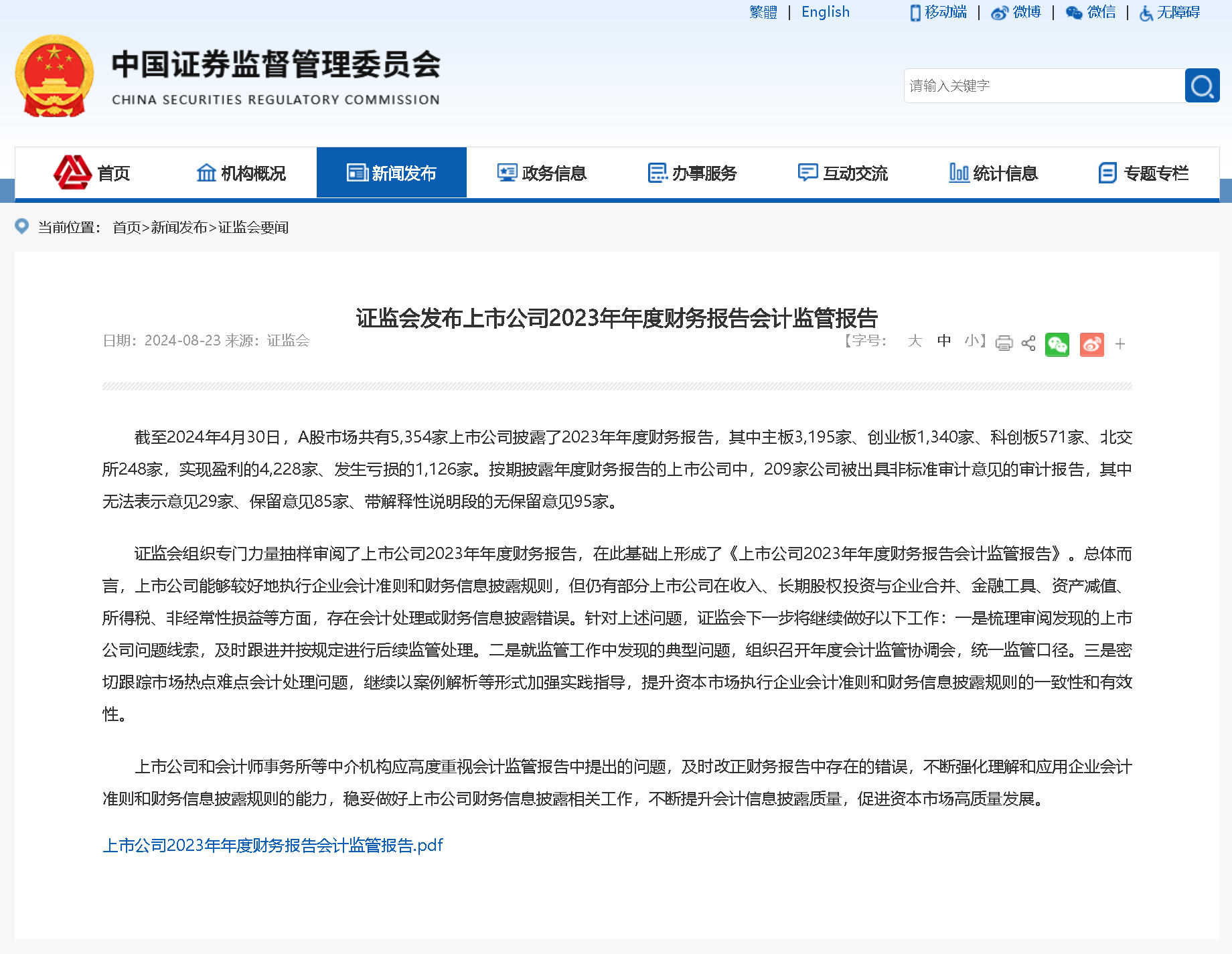 證監(jiān)會發(fā)布上市公司2023年年度財務(wù)報告會計監(jiān)管報告