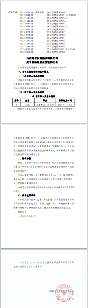 1月2日,山西建投發(fā)布公告稱,根據(jù)《山西省人民政府關(guān)于任希杰等3人任免職務(wù)的通知》,山西省政府決定任命杜銳為山西建投集團副董事長,提名為總經(jīng)理人選。經(jīng)董事會會議研究決定,聘任杜銳為山西建投集團總經(jīng)理。