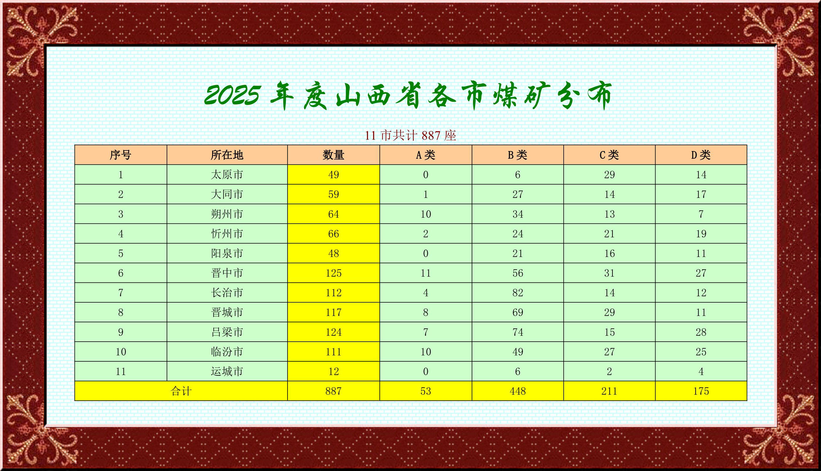 為進一步推動全省煤礦分類工作,按照省政府辦公廳《關(guān)于印發(fā)山西省煤礦分級分類安全監(jiān)管監(jiān)察辦法的通知》(晉政辦發(fā)〔2020〕22 號)要求,省應(yīng)急廳對各市上報的 2025 年煤礦分類情況組織開展了審核、公示工作,其中 A 類煤礦 53 座、B 類煤礦 448 座、C 類煤礦 211 座、D 類煤礦 175 座。