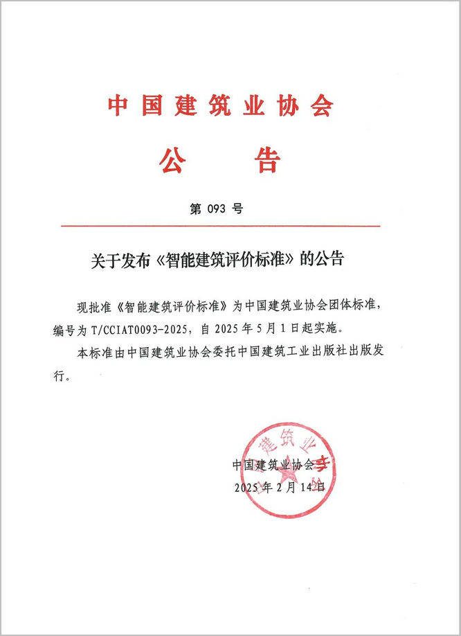 現(xiàn)批準(zhǔn)《智能建筑評(píng)價(jià)標(biāo)準(zhǔn)》為中國(guó)建筑業(yè)協(xié)會(huì)團(tuán)體標(biāo)準(zhǔn),編號(hào)為T(mén)/CCIAT0093-2025,自2025年5月1日起實(shí)施。