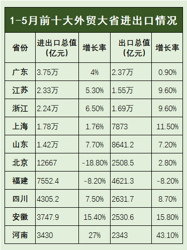 近日,多個省份公布今年前5月出口數據,前十大外貿省份出口幾乎都保持增長,而唯一一個下降的省份——福建的降幅也逐月縮小。