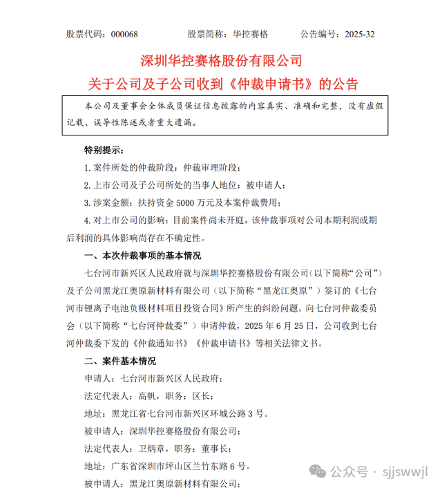 6月25日,華控賽格及子公司黑龍江奧原新材料有限公司收到七臺(tái)河仲裁委員會(huì)的《仲裁通知書》及相關(guān)法律文書,6月27日首次披露仲裁情況,正式宣告案件進(jìn)入仲裁程序。