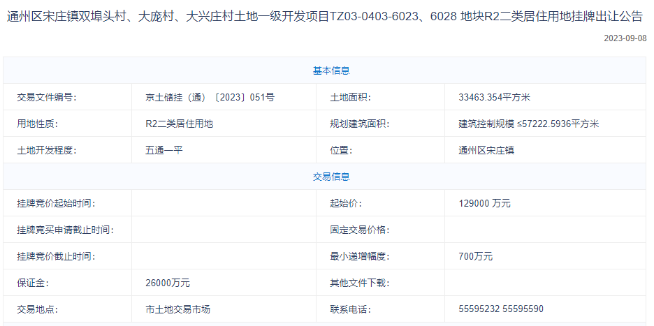 公開(kāi)資料顯示,該宗地為通州區(qū)宋莊鎮(zhèn)雙埠頭村、大龐村、大興莊村土地一級(jí)開(kāi)發(fā)項(xiàng)目TZ03-0403-6023、6028地塊,用地性質(zhì)為R2二類居住用地,位于北京市通州區(qū)宋莊鎮(zhèn),四至范圍為:宋莊鎮(zhèn)小堡藝術(shù)區(qū)北側(cè),東至徐宋路,西至規(guī)劃道路,南至規(guī)劃防護(hù)綠地用地,北至規(guī)劃道路,土地面積約33463.354平方米,建筑控制規(guī)模約57222.5936平方米。交易起始價(jià)12.9億元。