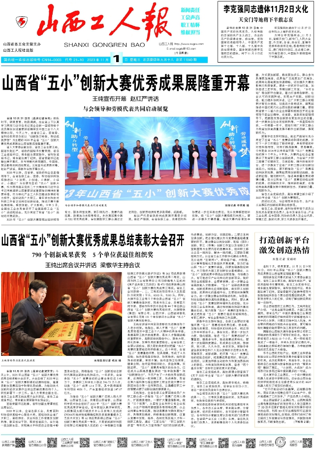 本報10月31日訊(首席記者吳艷)深秋時節(jié),碩果累累、收獲滿滿。在全省上下認(rèn)真學(xué)習(xí)貫徹習(xí)近平總書記同全總新一屆領(lǐng)導(dǎo)班子成員集體談話重要講話精神及中國工會十八大精神之際,今天上午,由省總工會、團(tuán)省委、省科協(xié)共同舉辦的以“創(chuàng)新助力轉(zhuǎn)型、勞動成就夢想”為主題的2023年全省“五小”創(chuàng)新大賽優(yōu)秀成果展在山西省展覽館隆重開幕。
