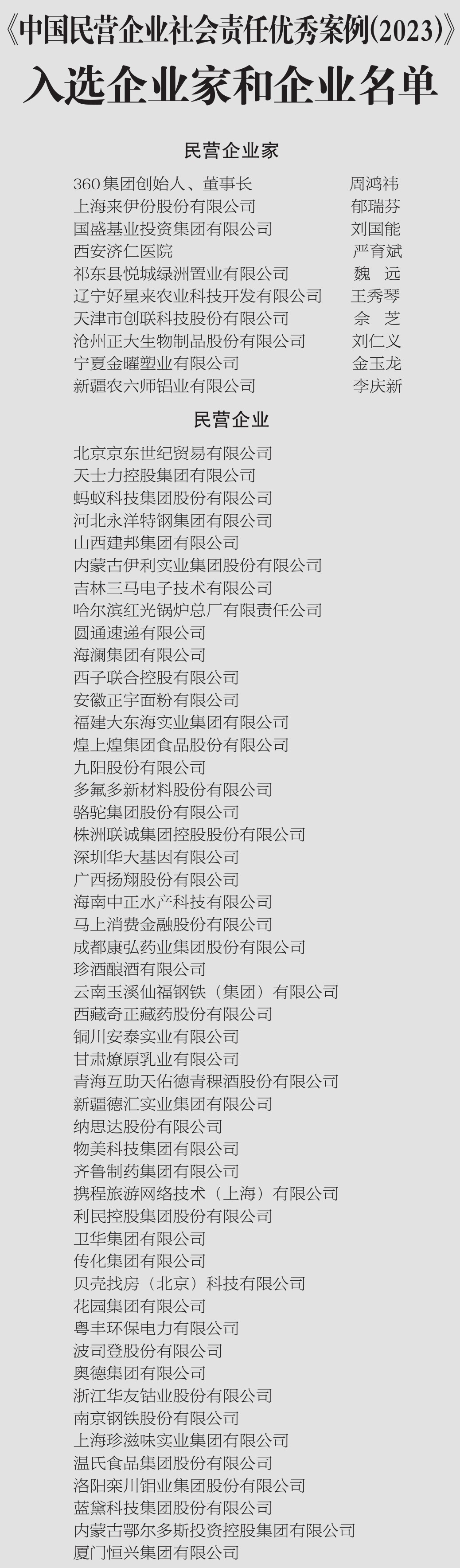 會上,發(fā)布了《中國民營企業(yè)社會責(zé)任優(yōu)秀案例(2023)》,360集團(tuán)創(chuàng)始人、董事長周鴻祎等10位民營企業(yè)家和北京京東世紀(jì)貿(mào)易有限公司等50家民營企業(yè)入選2023年中國民營企業(yè)社會責(zé)任優(yōu)秀案例。(相關(guān)報(bào)道見02版)