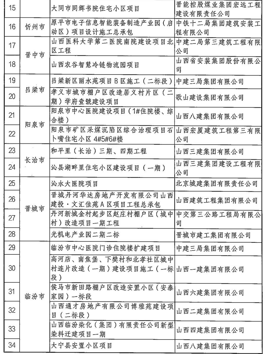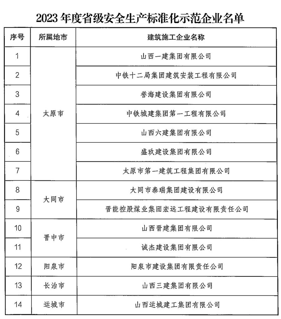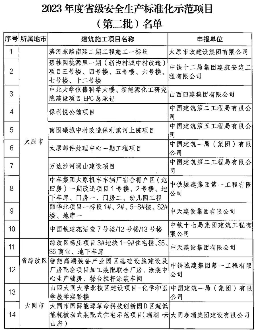 根據(jù)《山西省住房和城鄉(xiāng)建設廳建筑施工安全生產(chǎn)標準化創(chuàng)建和考評實施細則》,經(jīng)企業(yè)自主申報,省廳組織專家資料審查、現(xiàn)場核查,評定山西一建集團有限公司等14個企業(yè)為2023年度“省級安全生產(chǎn)標準化示范企業(yè)”,評定濱河東路南延二期工程施工一標段等38個項目為2023年度第二批“省級安全生產(chǎn)標準化示范項目”,且經(jīng)公示無異議,現(xiàn)將名單予以公布。
