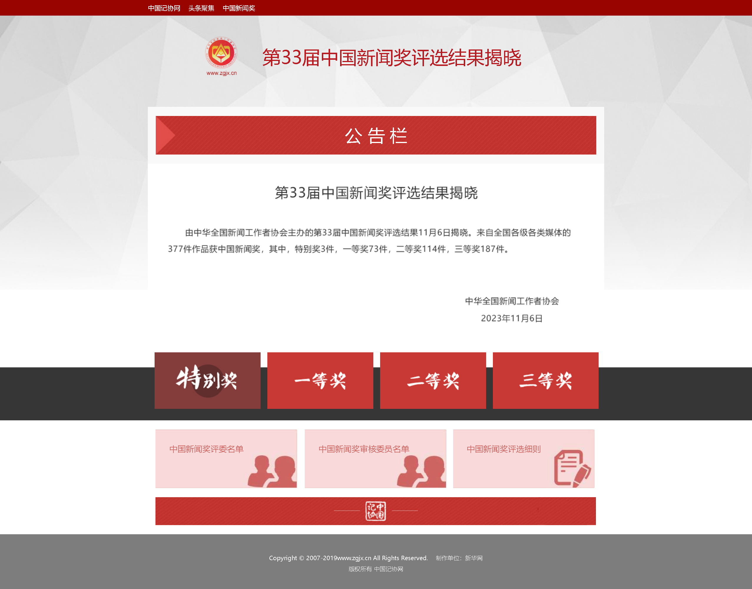 新華社北京11月6日電 由中華全國(guó)新聞工作者協(xié)會(huì)主辦的第33屆中國(guó)新聞獎(jiǎng)評(píng)選結(jié)果11月6日揭曉。來(lái)自全國(guó)各級(jí)各類媒體的377件作品獲中國(guó)新聞獎(jiǎng),其中,特別獎(jiǎng)3件,一等獎(jiǎng)73件,二等獎(jiǎng)114件,三等獎(jiǎng)187件。