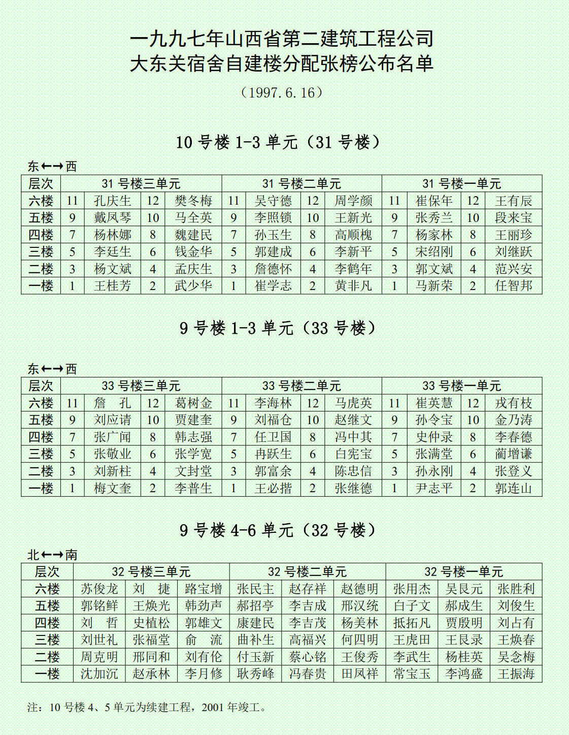 回到主題,下面是省建二公司上世紀(jì)末,最后一次福利分房,當(dāng)時(shí)每平米價(jià)格是408元。找到山西二建、山西四建的資料后,捎帶看到這份分房榜。一下子又把我?guī)Щ?997年,那次張榜公布最后定案的名單。那時(shí)候,這可是公司所有職工盼望已久,翹首以待的結(jié)果,真是有人歡喜有人愁啊!看到了嗎,我分到的房子,可以說是上上等,無論從位置、層次、光照、朝向看,都無話可說,那是上上下下幾千人都日思夜想的愿望??!之前,我并沒有因?yàn)閭€(gè)人利益找過任何公司領(lǐng)導(dǎo),倒是主管分房的領(lǐng)導(dǎo)專門到科里征求我的意見,看上哪套要哪套,其他人不征求個(gè)人意見,只對科長你例外!我攜了妻子、兒子去自建樓實(shí)地考察。六層磚混結(jié)構(gòu)樓,按說三層為佳,可是由于樓間距問題,四層光照更好一些,這對妻子的關(guān)節(jié)炎有好處。一家人充分協(xié)商,最后確定了中間單元四層左戶?;毓?,也就打個(gè)電話告知分房領(lǐng)導(dǎo)。現(xiàn)在回想起來,當(dāng)時(shí)確實(shí)欠妥,看把你了不得的,你的架子也忒大了吧!連一句感謝的話都舍不得說,別人把分房領(lǐng)導(dǎo)的門都踏破了,使出渾身解數(shù),哭的、鬧的、軟硬兼施,最后還是不能如愿,甚至記恨一輩子!