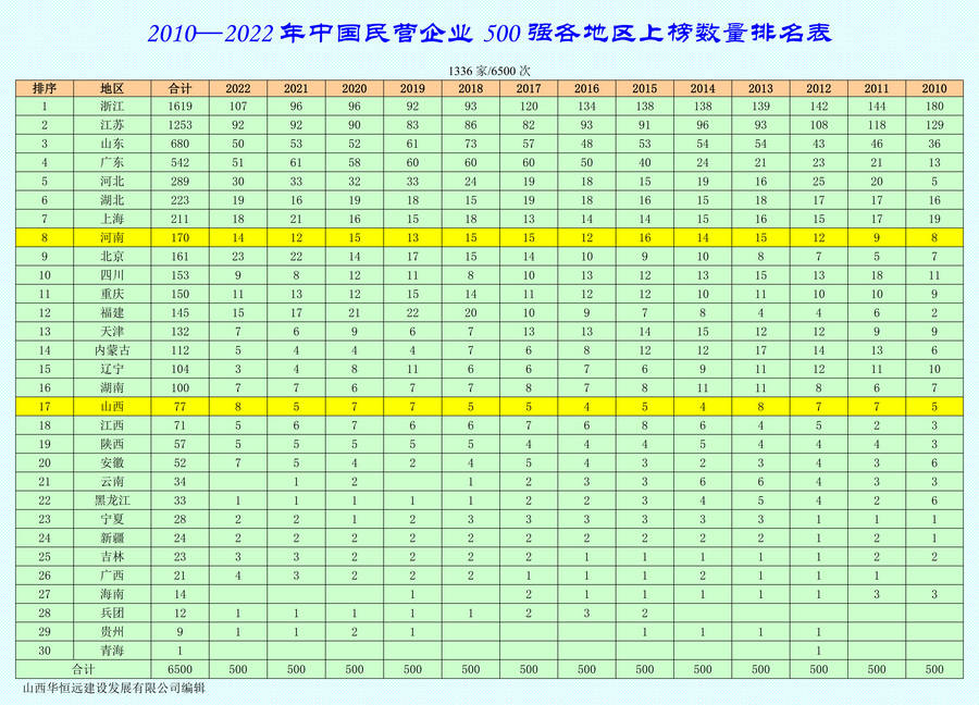 2010-2022 年中國(guó)民營(yíng)企業(yè) 500 強(qiáng)入圍企業(yè)統(tǒng)計(jì)表