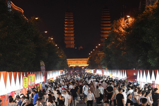 2024年7月16日,山西太原,雙塔寺前人山人海。豐富多彩的夜間主題活動,滿足人們舒適納涼的需求,進(jìn)一步催熱“夏日夜經(jīng)濟(jì)”。視覺中國 資料圖