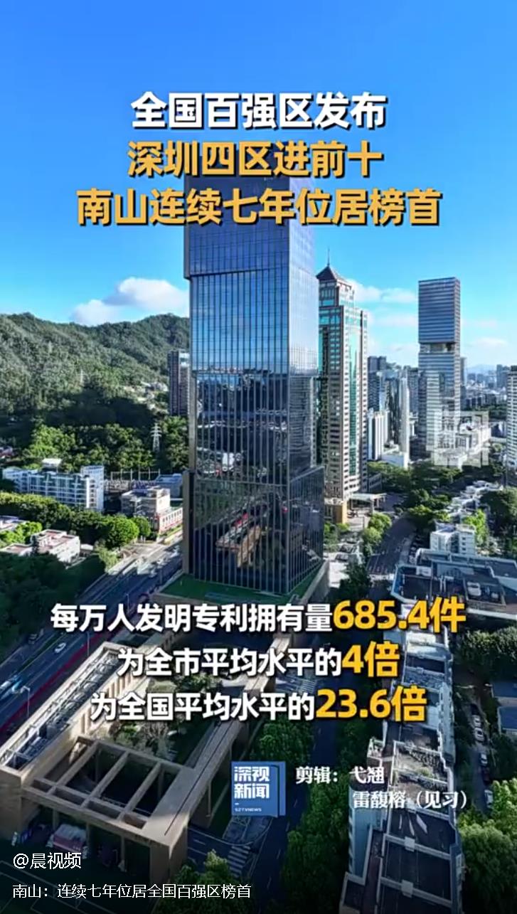 8月2日,賽迪顧問(wèn)城市經(jīng)濟(jì)研究中心發(fā)布“2024賽迪百?gòu)?qiáng)區(qū)”榜單,深圳南山區(qū)排名第一,這也是南山區(qū)連續(xù)7年位居全國(guó)百?gòu)?qiáng)區(qū)榜首。