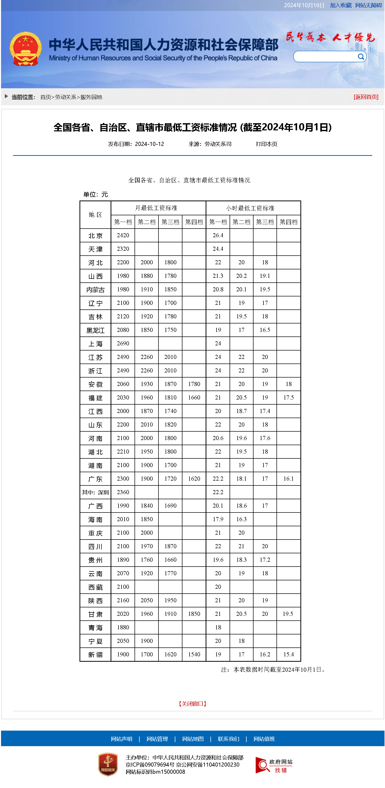 【綜合信息】全國各省、自治區(qū)、直轄市最低工資標(biāo)準(zhǔn)情況 (截至2024年10月1日)