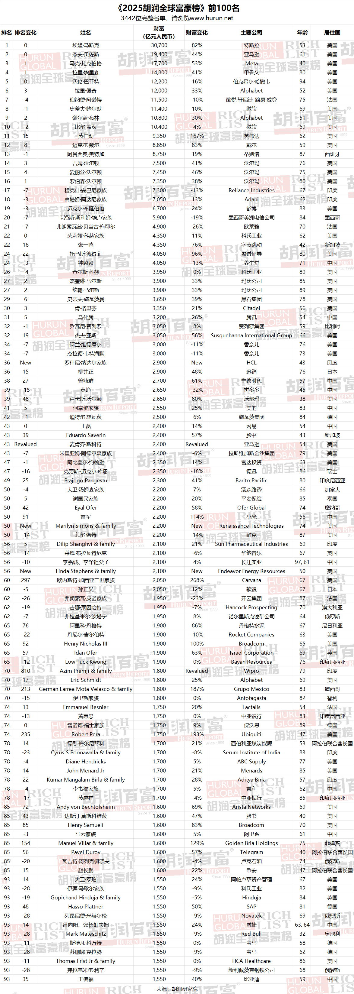 胡潤(rùn)研究院今日發(fā)布《2025胡潤(rùn)全球富豪榜》(Hurun Global Rich List 2025)。財(cái)富計(jì)算的截止日期為2025年1月15日。這是胡潤(rùn)研究院連續(xù)第14年發(fā)布“全球富豪榜”。