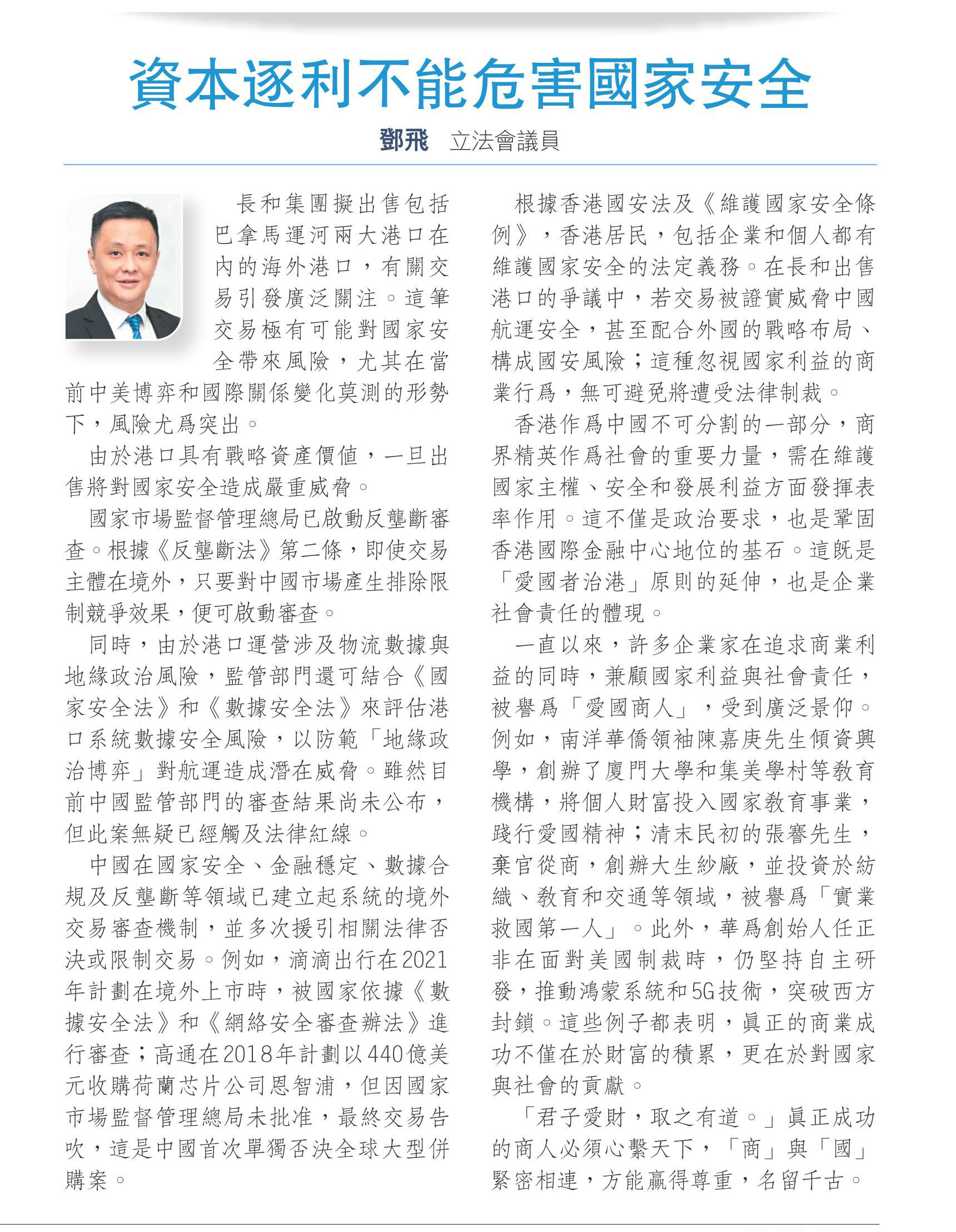 根據(jù)香港國安法及《維護國家安全條例》,香港居民,包括企業(yè)和個人都有維護國家安全的法定義務(wù)。在長和出售港口的爭議中,若交易被證實威脅中國航運安全,甚至配合外國的戰(zhàn)略布局、構(gòu)成國安風(fēng)險;這種忽視國家利益的商業(yè)行為,無可避免將遭受法律制裁。