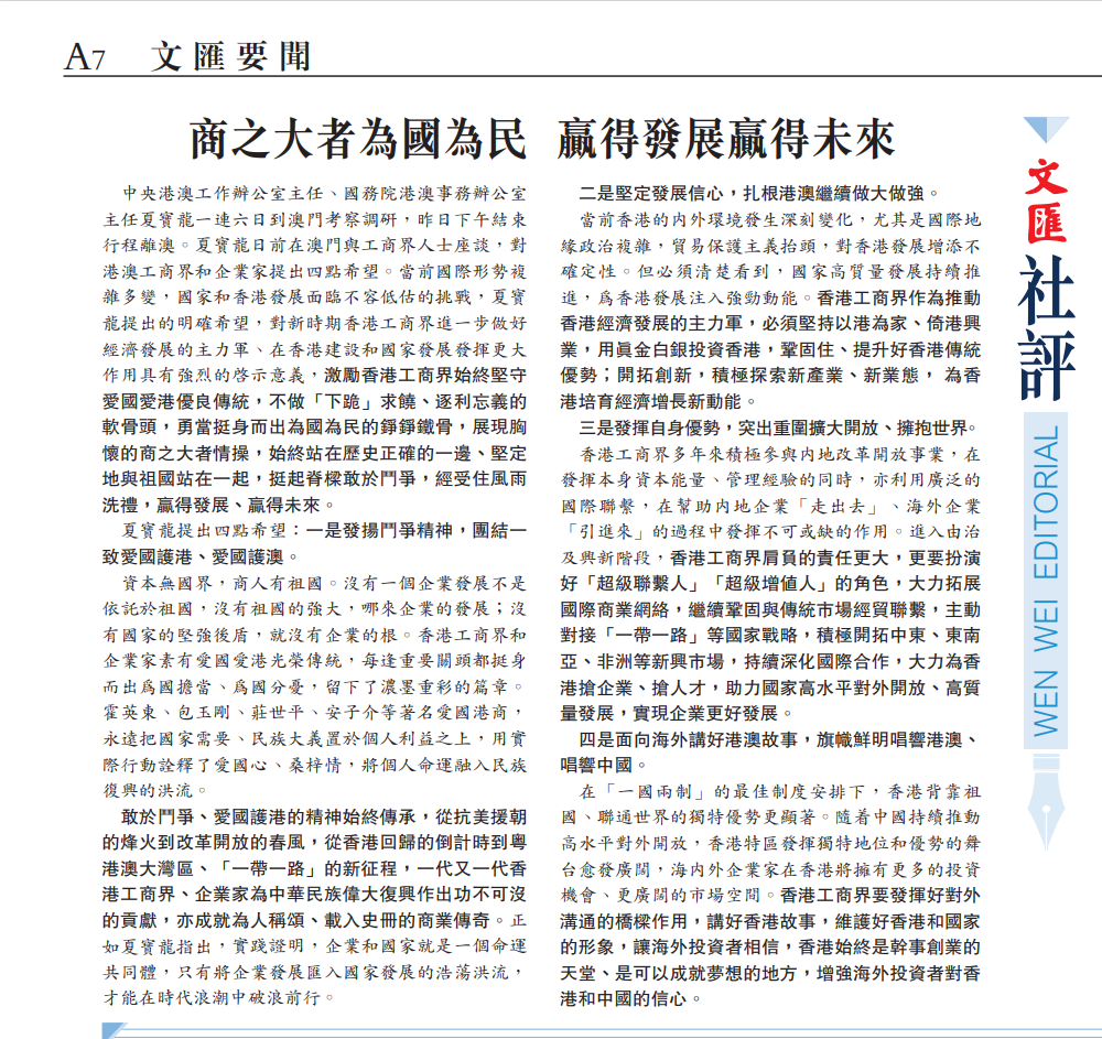 中央港澳工作辦公室主任、國務(wù)院港澳事務(wù)辦公室主任夏寶龍一連六日到澳門考察調(diào)研,昨日下午結(jié)束行程離澳。夏寶龍日前在澳門與工商界人士座談,對港澳工商界和企業(yè)家提出四點(diǎn)希望。當(dāng)前國際形勢復(fù)雜多變,國家和香港發(fā)展面臨不容低估的挑戰(zhàn),夏寶龍?zhí)岢龅拿鞔_希望,對新時(shí)期香港工商界進(jìn)一步做好經(jīng)濟(jì)發(fā)展的主力軍、在香港建設(shè)和國家發(fā)展發(fā)揮更大作用具有強(qiáng)烈的啟示意義,激勵(lì)香港工商界始終堅(jiān)守愛國愛港優(yōu)良傳統(tǒng),不做「下跪」求饒、逐利忘義的軟骨頭,勇當(dāng)挺身而出為國為民的錚錚鐵骨,展現(xiàn)胸懷的商之大者情操,始終站在歷史正確的一邊、堅(jiān)定地與祖國站在一起,挺起脊梁敢于斗爭,經(jīng)受住風(fēng)雨洗禮,贏得發(fā)展、贏得未來。