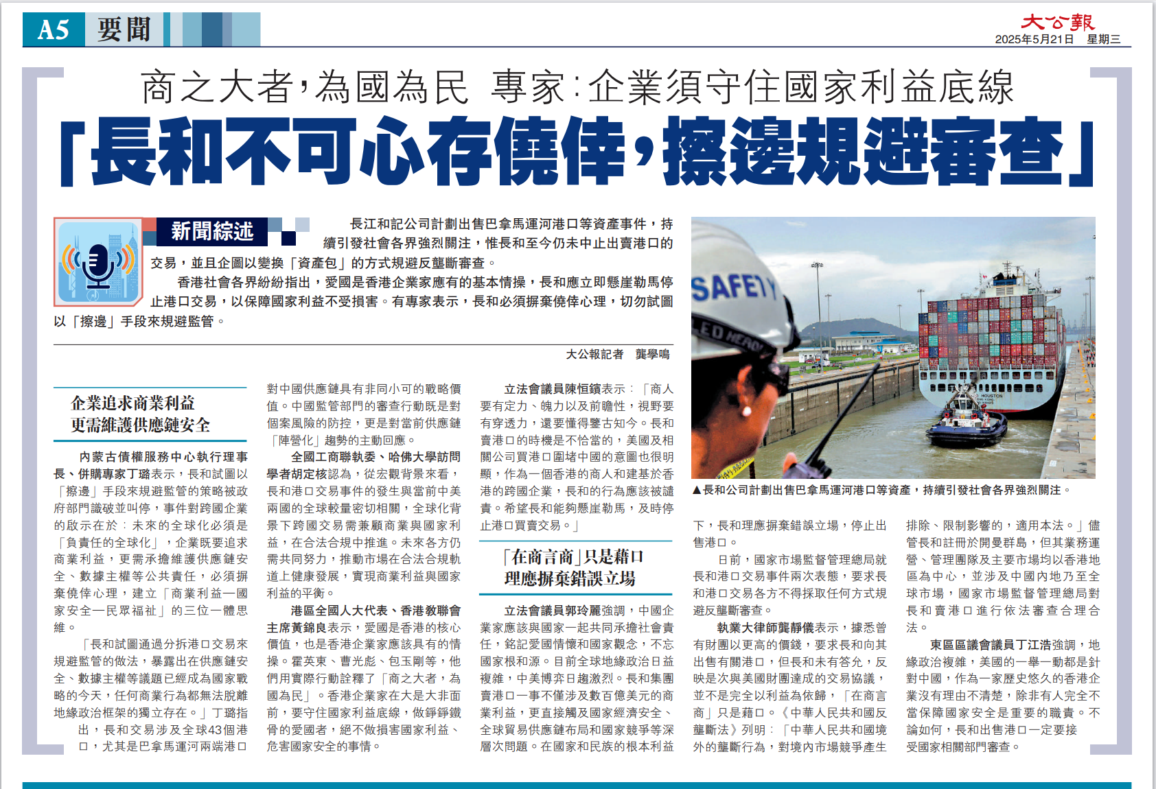 香港社會(huì)各界紛紛指出,愛(ài)國(guó)是香港企業(yè)家應(yīng)有的基本情操,長(zhǎng)和應(yīng)立即懸崖勒馬停止港口交易,以保障國(guó)家利益不受損害。有專(zhuān)家表示,長(zhǎng)和必須摒棄僥幸心理,切勿試圖以「擦邊」手段來(lái)規(guī)避監(jiān)管。 \大公報(bào)記者龔學(xué)鳴