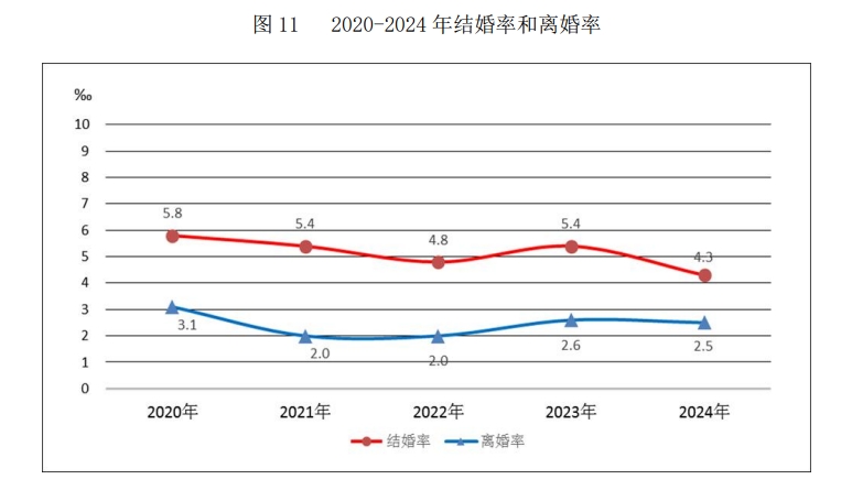 《公報(bào)》數(shù)據(jù)顯示,2024年,全國(guó)婚姻登記機(jī)構(gòu)和場(chǎng)所共計(jì)4190個(gè),其中婚姻登記機(jī)構(gòu)1134個(gè),全年依法辦理結(jié)婚登記610.6萬對(duì),比上年下降20.5%。結(jié)婚率為4.3‰,比上年下降1.1個(gè)千分點(diǎn)。依法辦理離婚手續(xù)351.3萬對(duì),其中:民政部門登記離婚262.2萬對(duì),法院判決、調(diào)解離婚89.1萬對(duì)。離婚率為2.5‰。