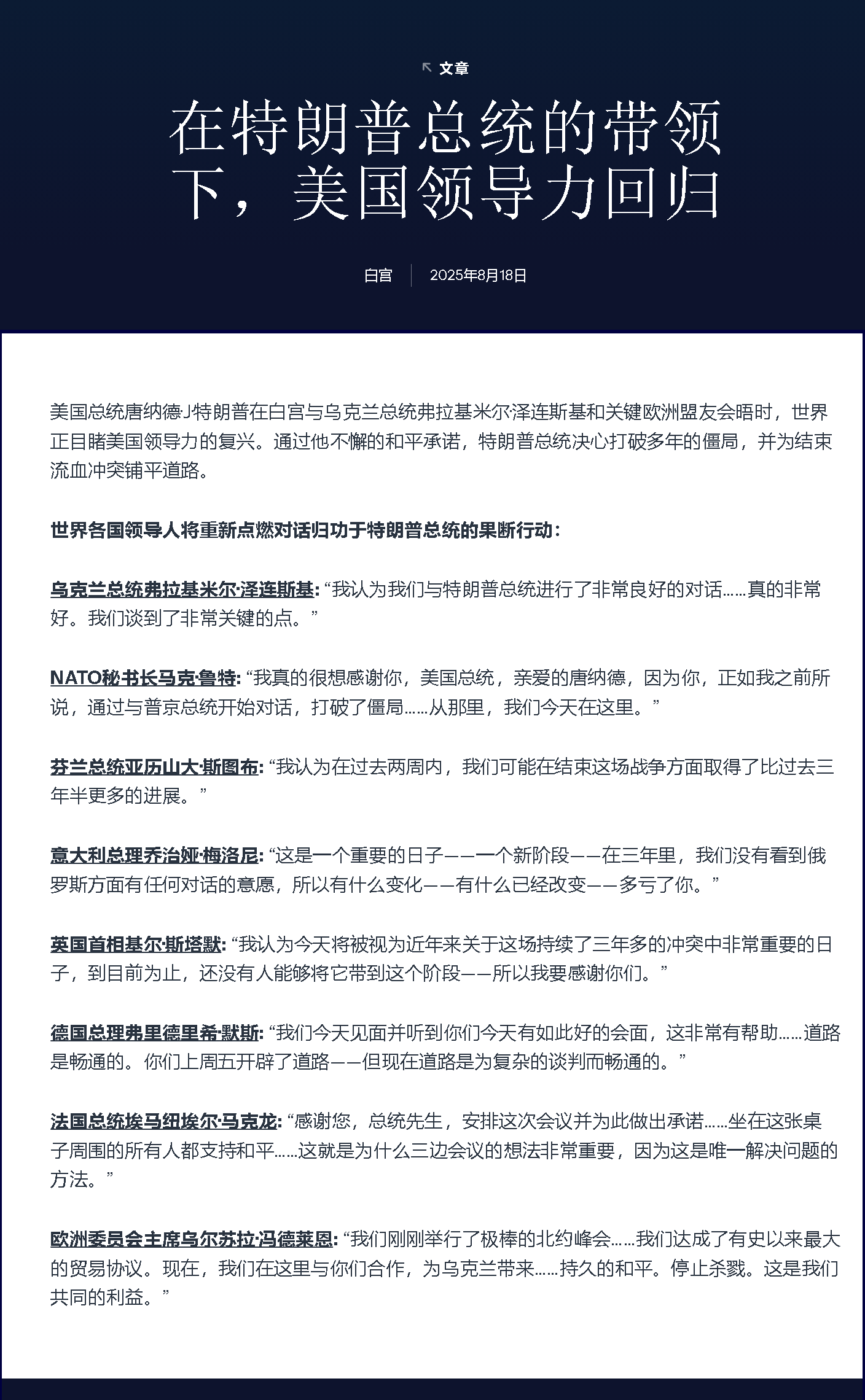 芬蘭總統(tǒng)亞歷山大·斯圖布: “我認(rèn)為在過(guò)去兩周內(nèi),我們可能在結(jié)束這場(chǎng)戰(zhàn)爭(zhēng)方面取得了比過(guò)去三年半更多的進(jìn)展?!?