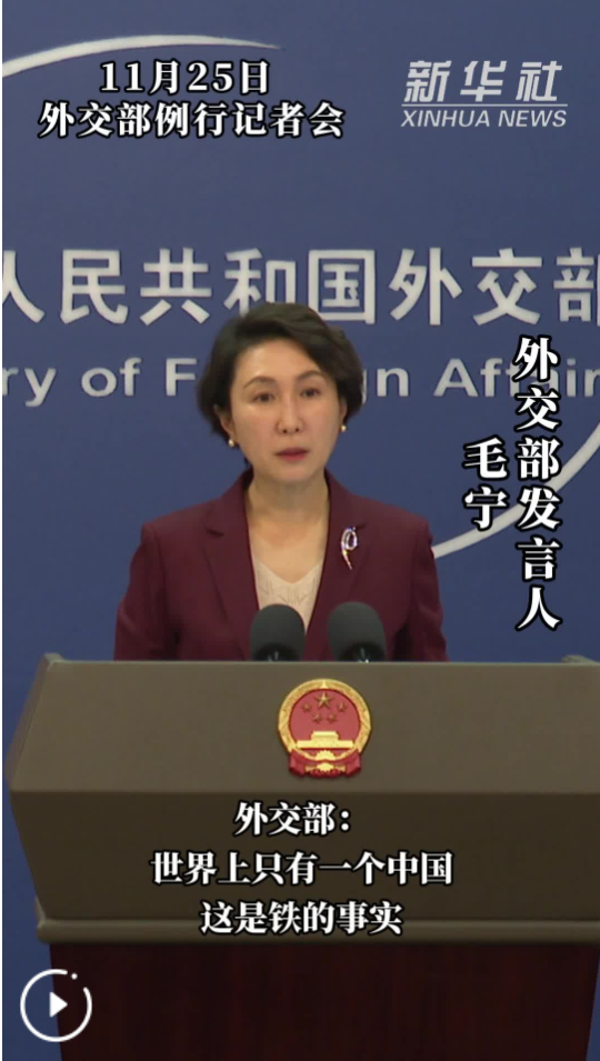 新華社北京11月25日電(記者劉楊、馮歆然)外交部發(fā)言人毛寧25日表示,世界上只有一個(gè)中國(guó),臺(tái)灣是中國(guó)領(lǐng)土不可分割的一部分,這是鐵的事實(shí),不容歪曲篡改。