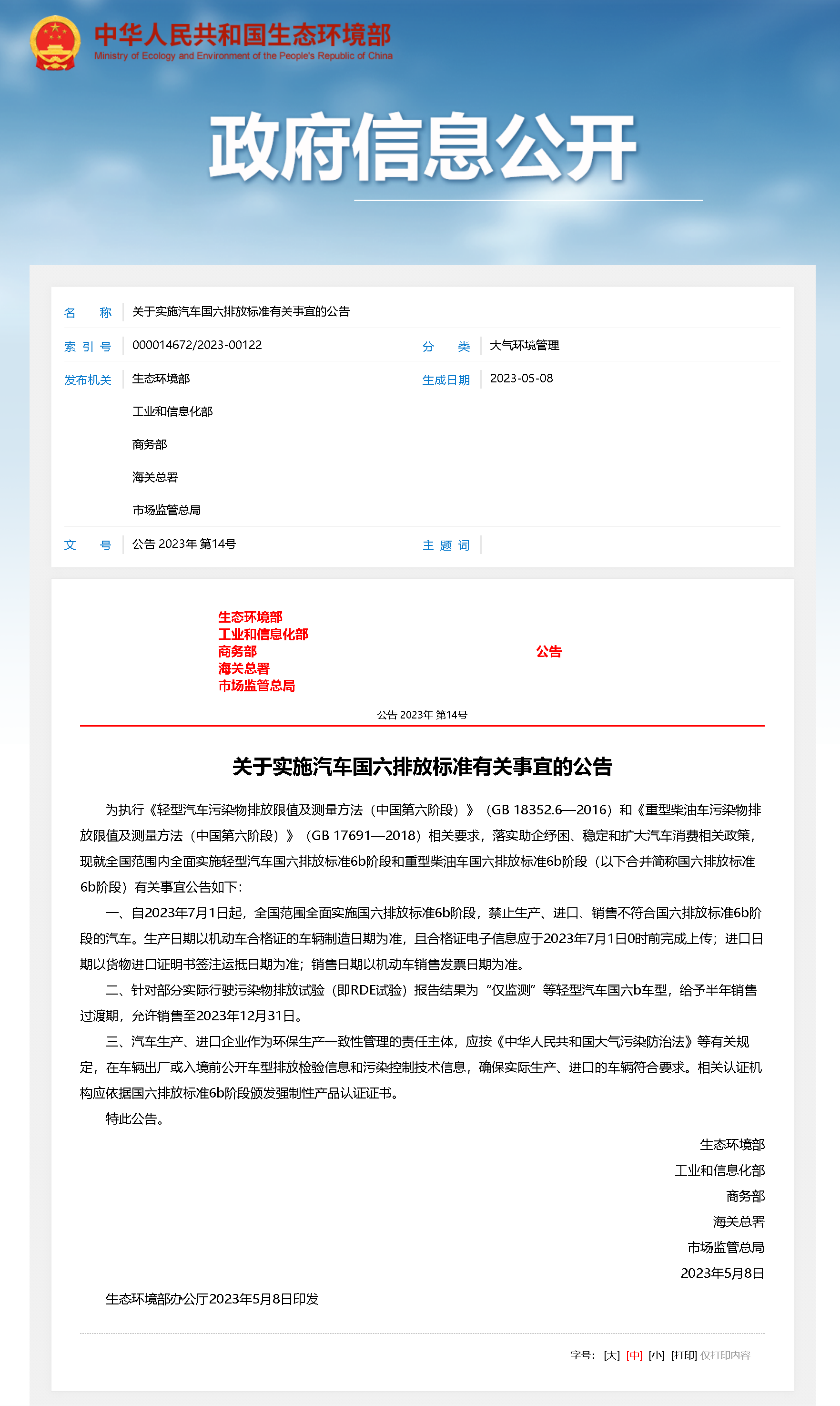 根據(jù)生態(tài)環(huán)境部、工信部、商務部、海關總署、市場監(jiān)管總局日前聯(lián)合發(fā)布的公告,本次汽車排放標準提升包括輕型汽車和重型柴油車。生產(chǎn)日期以機動車合格證的車輛制造日期為準,且合格證電子信息應于2023年7月1日0時前完成上傳;進口日期以貨物進口證明書簽注運抵日期為準;銷售日期以機動車銷售發(fā)票日期為準。