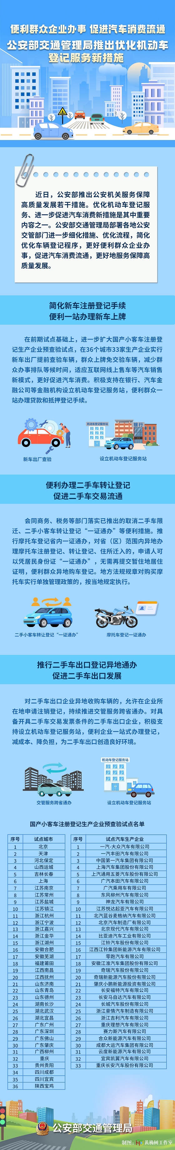 一、簡(jiǎn)化新車注冊(cè)登記手續(xù),便利一站辦理新車上牌。在前期試點(diǎn)基礎(chǔ)上,進(jìn)一步擴(kuò)大國(guó)產(chǎn)小客車注冊(cè)登記生產(chǎn)企業(yè)預(yù)查驗(yàn)試點(diǎn),在36個(gè)城市33家生產(chǎn)企業(yè)實(shí)行新車出廠提前查驗(yàn)車輛,群眾上牌免交驗(yàn)車輛,減少群眾辦事排隊(duì)等候時(shí)間,適應(yīng)互聯(lián)網(wǎng)線上售車等汽車銷售新模式,更好促進(jìn)汽車消費(fèi)。積極支持在銀行、汽車金融公司等金融機(jī)構(gòu)設(shè)立機(jī)動(dòng)車登記服務(wù)站,便利群眾一站辦理貸款和抵押登記手續(xù)。