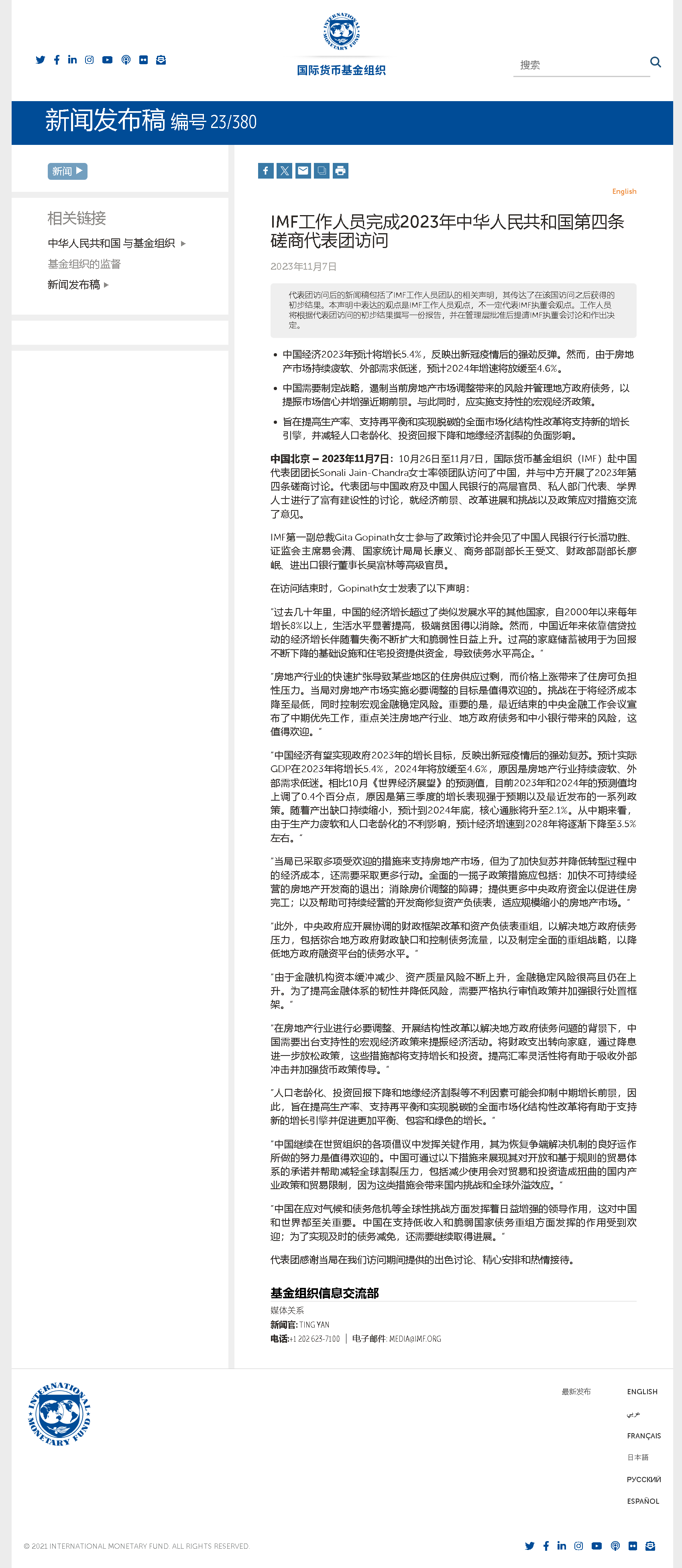 上證報中國證券網(wǎng)訊(記者 何漪)11月7日,IMF官網(wǎng)發(fā)布最新預測稱,中國實際GDP在2023年將增長5.4%,2024年增速為4.6%。相較于其10月“世界經(jīng)濟展望”的預測值,目前2023年和2024年的預測值均上調(diào)了0.4個百分點。