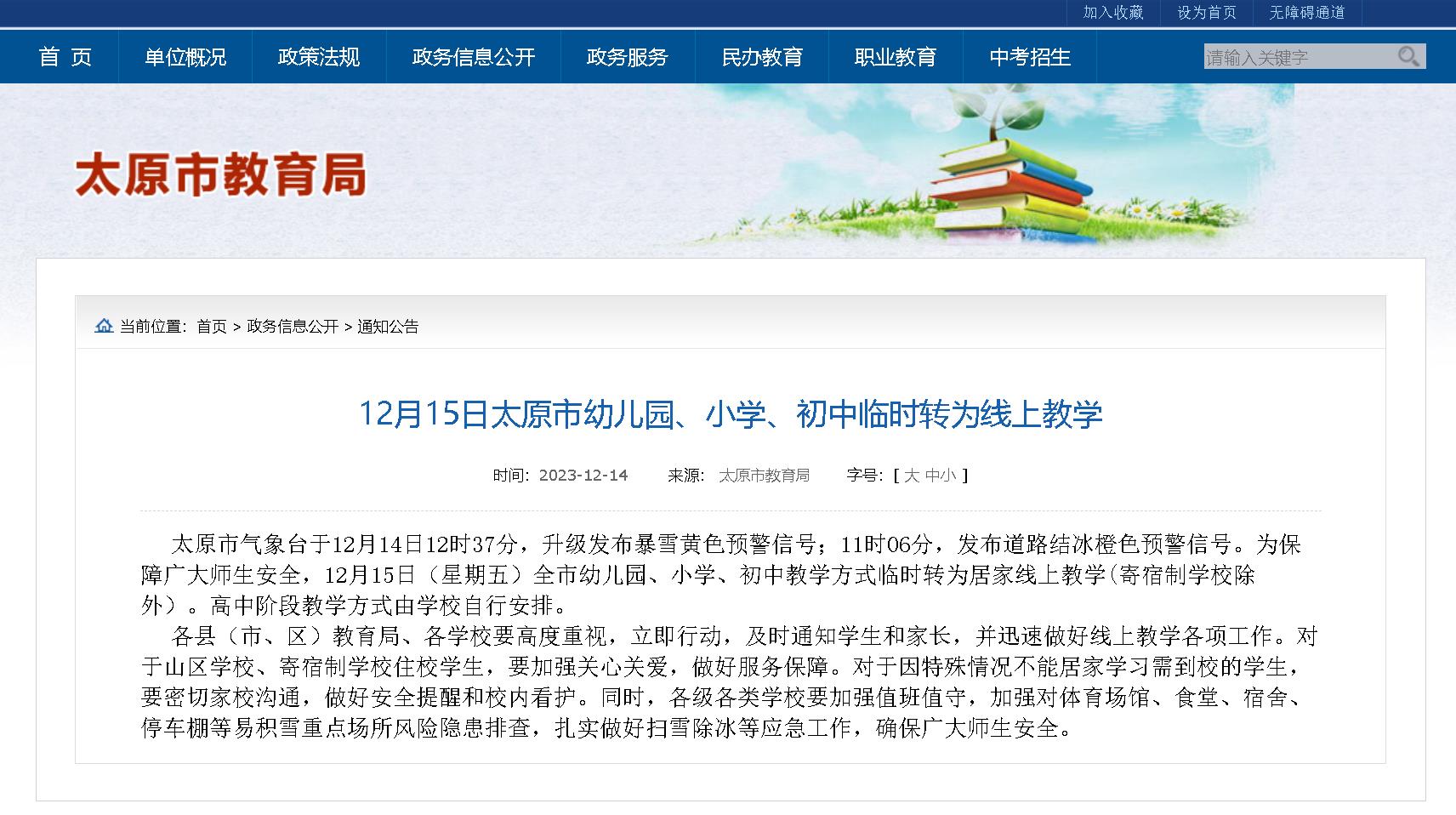 太原市氣象臺(tái)于12月14日12時(shí)37分,升級(jí)發(fā)布暴雪黃色預(yù)警信號(hào);11時(shí)06分,發(fā)布道路結(jié)冰橙色預(yù)警信號(hào)。為保障廣大師生安全,太原市教育局發(fā)布:12月15日(星期五)太原市幼兒園、小學(xué)、初中教學(xué)方式臨時(shí)轉(zhuǎn)為居家線上教學(xué)。高中階段教學(xué)方式由學(xué)校自行安排。