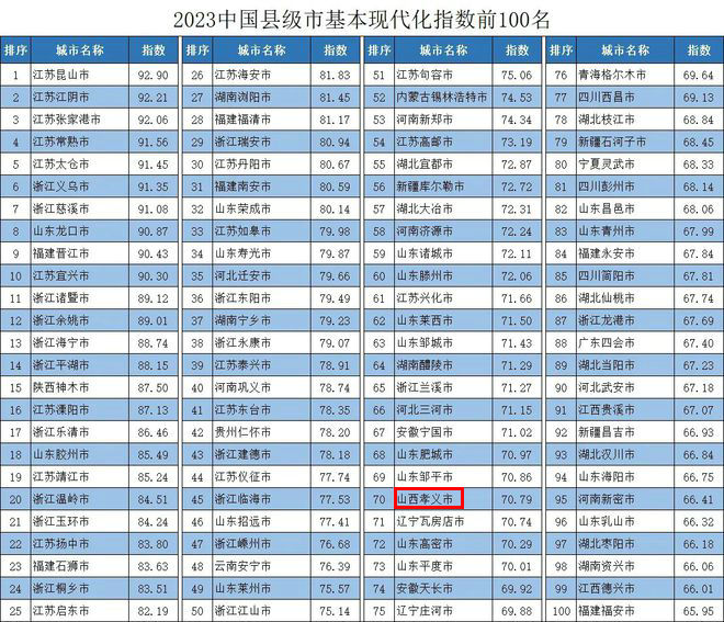 《報告》顯示,2023中國縣級市基本現(xiàn)代化指數(shù)前100名中,江蘇昆山市、江陰市、張家港市位列前三。分區(qū)域看,前100名中,東部地區(qū)66個、中部地區(qū)20個、西部地區(qū)12個、東北地區(qū)2個,其中,中部地區(qū)數(shù)量增加3個,在四大區(qū)域中席次增加最多。分省看,江蘇和浙江數(shù)量最多,均為19個,山東18個。中國縣級市基本現(xiàn)代化指數(shù)前100名常住人口平均為89.09萬人、城鎮(zhèn)化率平均為66.1%,地區(qū)生產(chǎn)總值平均為1106億元,一般公共預(yù)算收入平均為72億元,社會消費品零售總額平均為346億元;人均地區(qū)生產(chǎn)總值平均為125649元,城鎮(zhèn)居民人均可支配收入平均為55260元,農(nóng)村居民人均可支配收入平均為31317元,城鄉(xiāng)居民人均可支配收入比平均為1.78;公共圖書館總藏書量平均為95萬冊;空氣質(zhì)量優(yōu)良率平均為85.4%,人均公園綠地面積平均為15.59平方米,地表水水質(zhì)達到或好于Ⅲ類水體比例平均為98.5%。