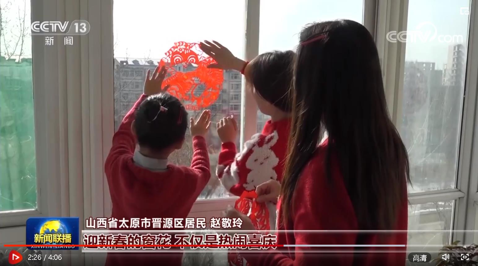 “在山西太原,‘五福臨門’‘玉兔迎春’等主題豐富的窗花,讓節(jié)日氣氛越發(fā)濃厚?!?a target="_blank">《新聞聯(lián)播》在《張燈結(jié)彩慶新春 喜慶祥和中國(guó)年》報(bào)道中,展示了太原市民剪窗花迎新春的喜悅。晉源區(qū)居民趙敬玲說(shuō):“迎新春的窗花,不僅僅是熱鬧喜慶,也寄托了我們對(duì)新春的祝愿。”