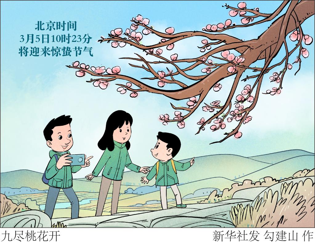 我國古代將驚蟄分為三候:一候桃始華,二候倉庚(黃鸝)鳴,三候鷹化為鳩。元稹對驚蟄的描寫貼合這“三候”,他寫道:“陽氣初驚蟄,韶光大地周。桃花開蜀錦,鷹老化春鳩?!?