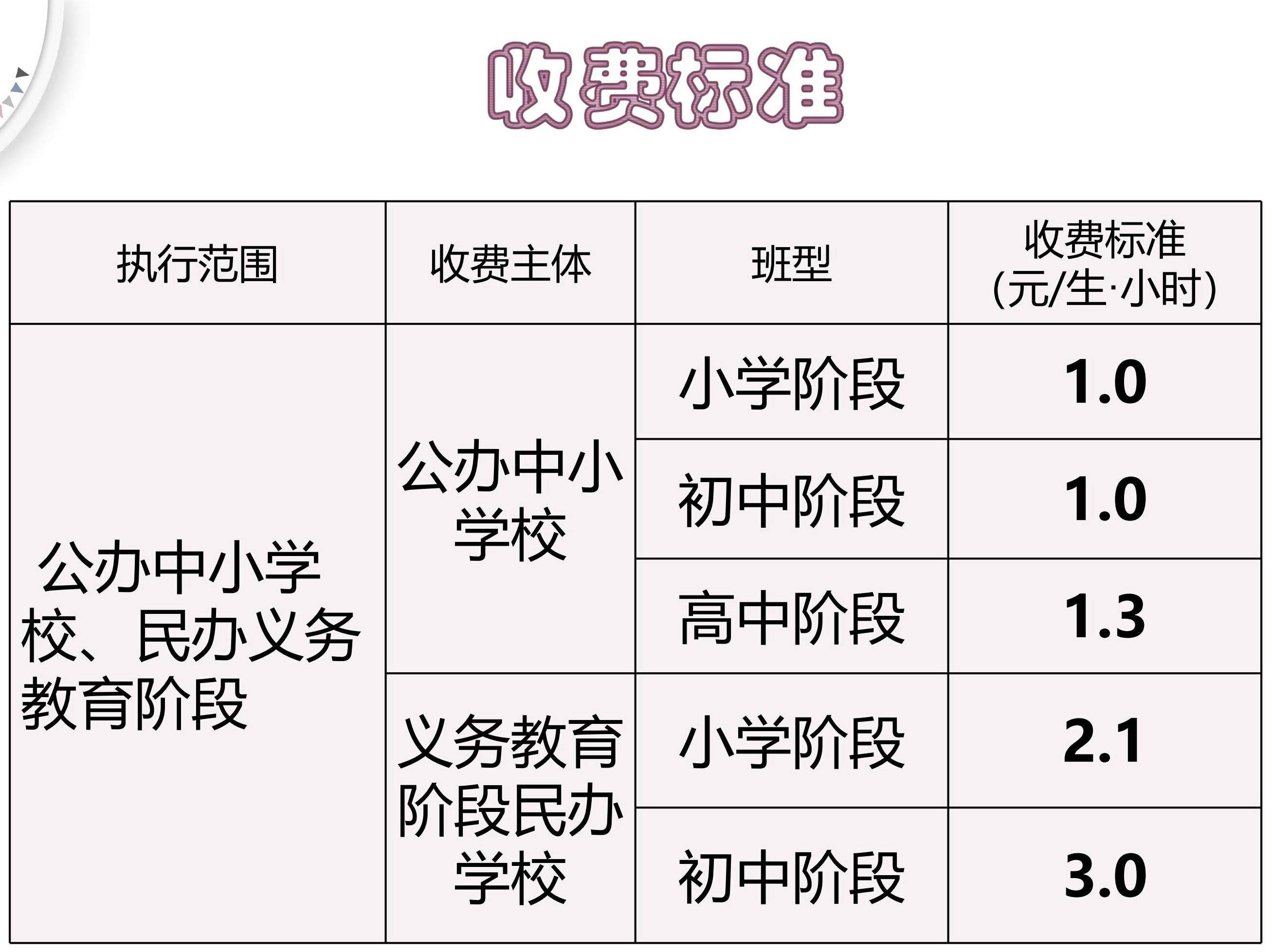中小學(xué)生課后服務(wù)收費屬于服務(wù)性收費,按學(xué)期由學(xué)校向?qū)W生收取。收費時應(yīng)使用稅務(wù)機(jī)關(guān)監(jiān)制的稅務(wù)發(fā)票。學(xué)校要嚴(yán)格執(zhí)行收費公示制度,將課后服務(wù)收費標(biāo)準(zhǔn)、服務(wù)時間、課程內(nèi)容等相關(guān)信息公開,主動接受學(xué)生、家長和社會監(jiān)督。