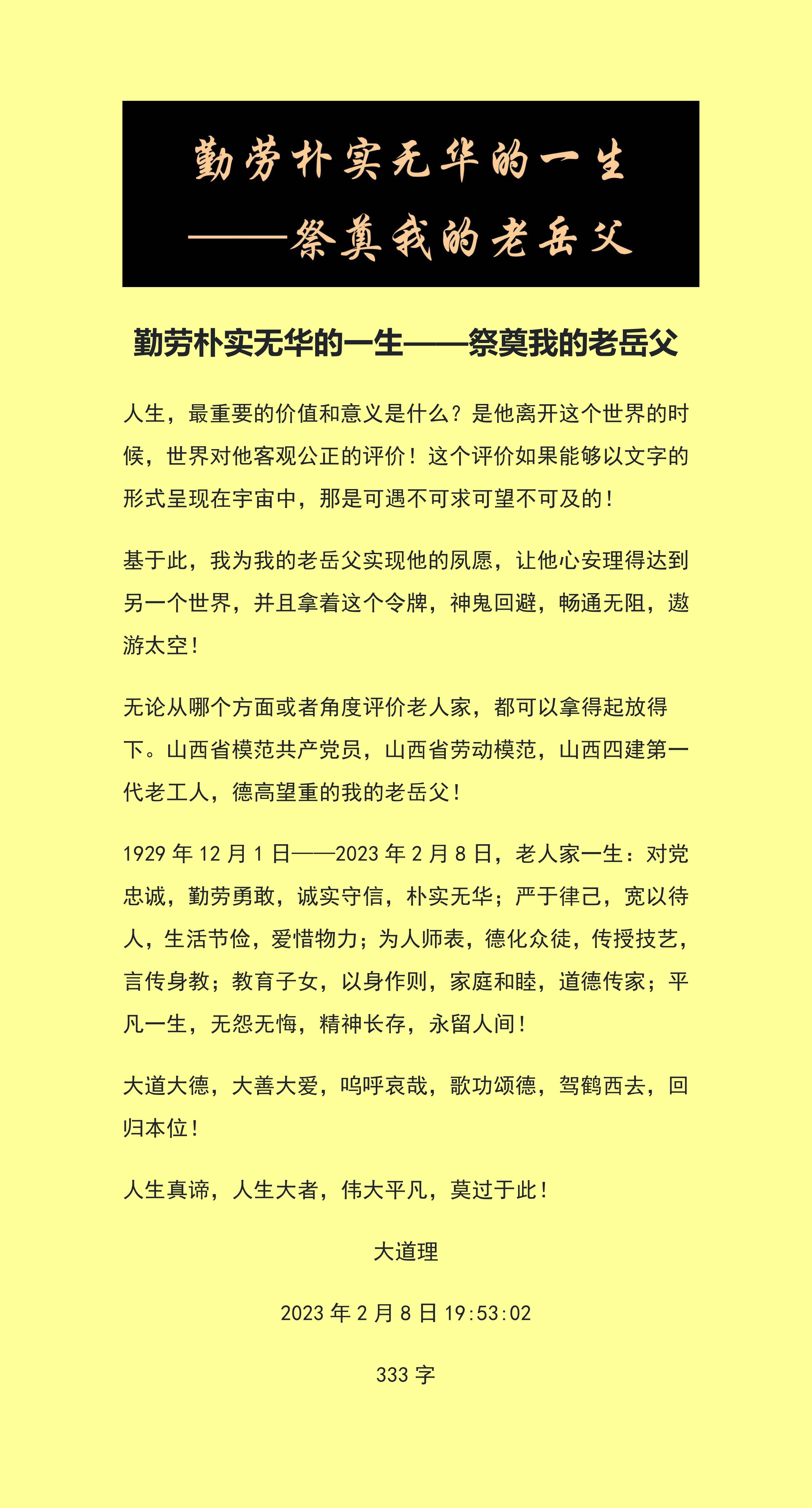 1929年12月1日——2023年2月8日,老人家一生:對(duì)黨忠誠,勤勞勇敢,誠實(shí)守信,樸實(shí)無華;嚴(yán)于律己,寬以待人,生活節(jié)儉,愛惜物力;為人師表,德化眾徒,傳授技藝,言傳身教;教育子女,以身作則,家庭和睦,道德傳家;平凡一生,無怨無悔,精神長存,永留人間!