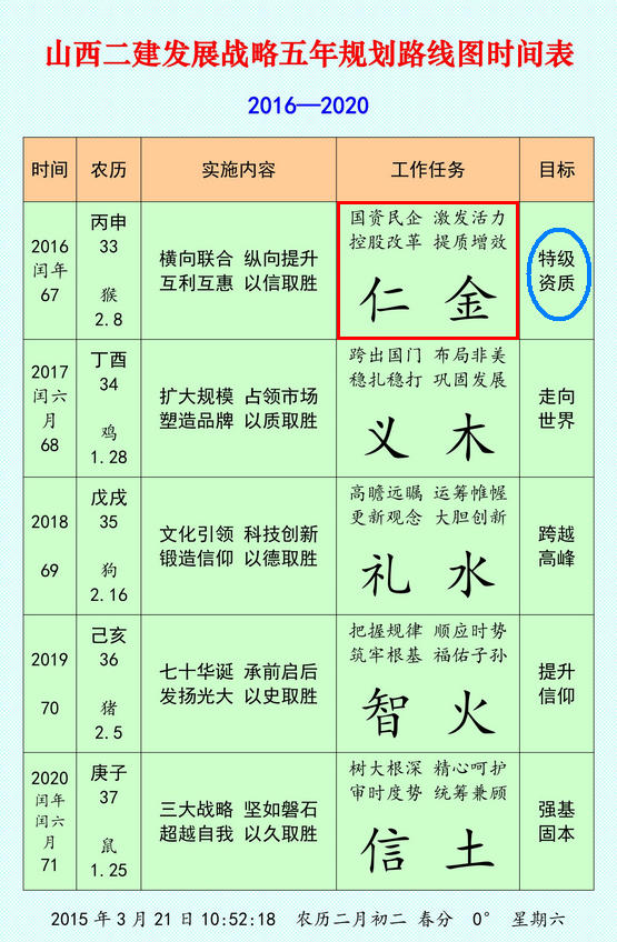 山西二建發(fā)展戰(zhàn)略五年路線圖和時(shí)間表,從2011年到2020年,分兩個(gè)五年兩個(gè)階段規(guī)劃了十年的成就,是考慮現(xiàn)實(shí)和實(shí)際的可能性與變化的環(huán)境形成的階段性感悟程度。換言之,就看決策者的維度能否自覺(jué)接受并且堅(jiān)定不移去執(zhí)行!任何事物,懷疑或者遲滯,必將功虧一簣事倍功半!重回大道,二十年以后的事情了!