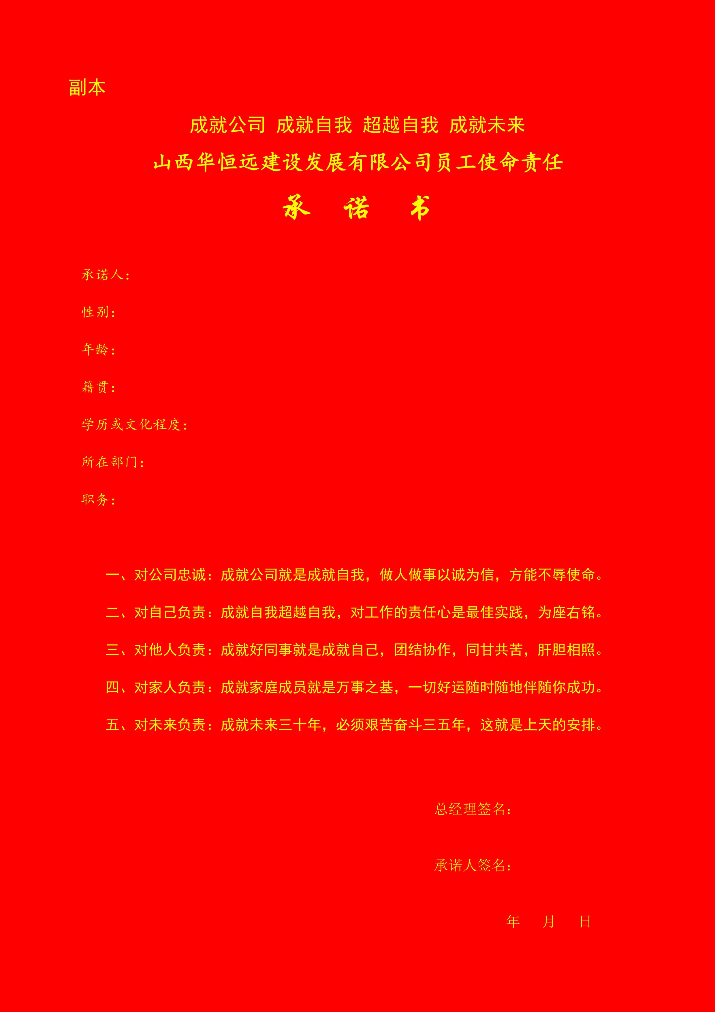 承諾書一式兩份,總經(jīng)理和承諾人各執(zhí)一份,作為對(duì)未來的承諾和勉勵(lì)!