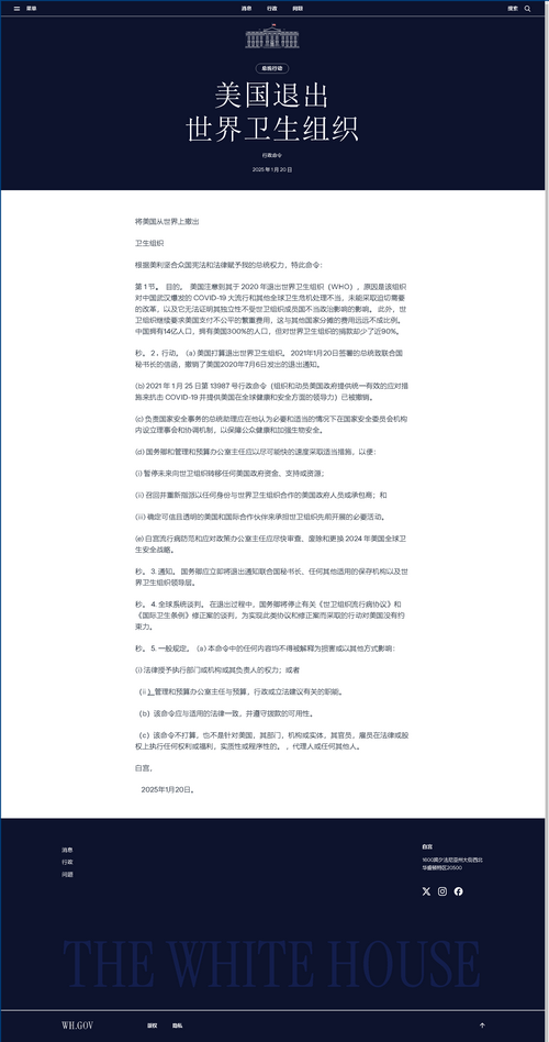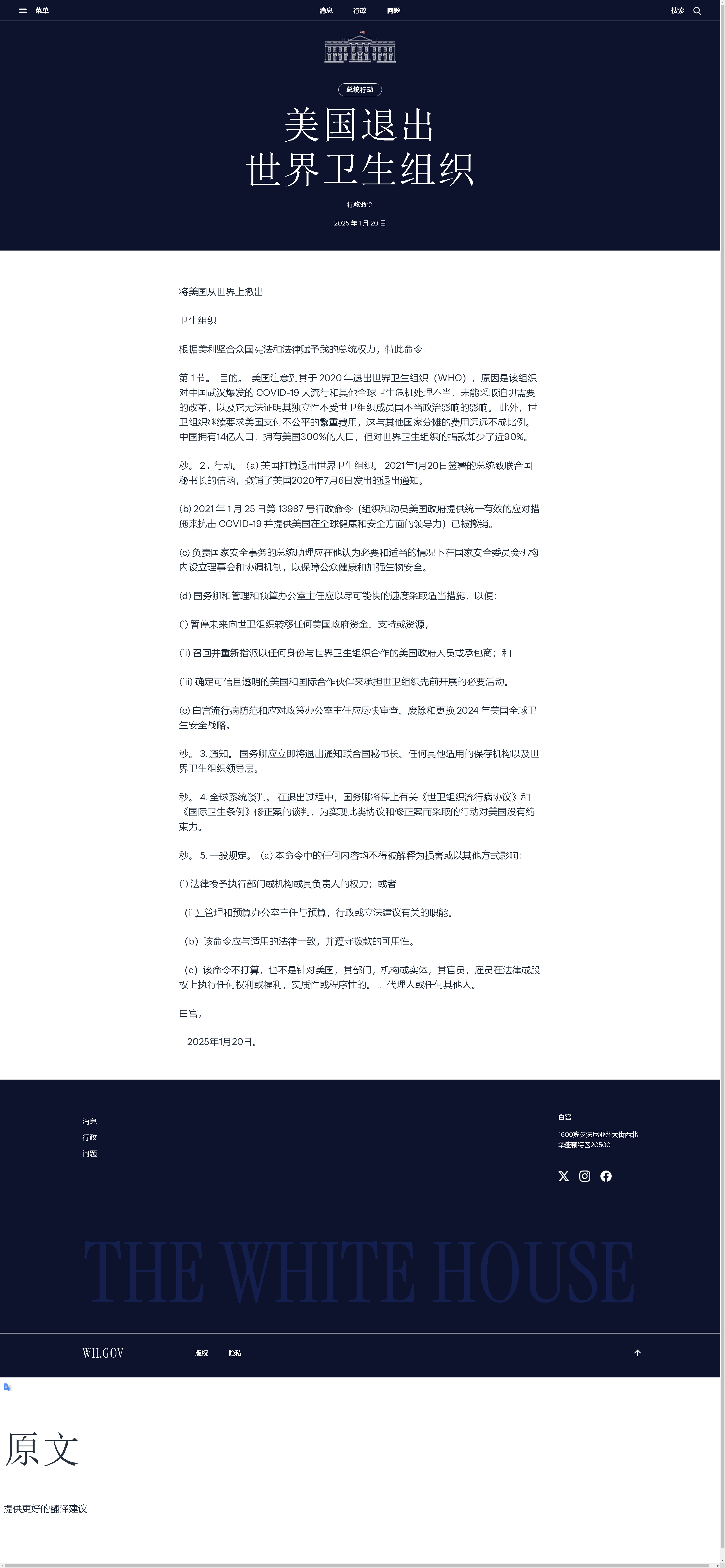 白宮發(fā)布的行政令稱,美國國務卿應將美國這一決定立即通知聯(lián)合國秘書長和世衛(wèi)組織領導層。行政令還要求盡快采取適當措施,暫停向世衛(wèi)組織提供任何來自美國政府的資金、支持和資源。