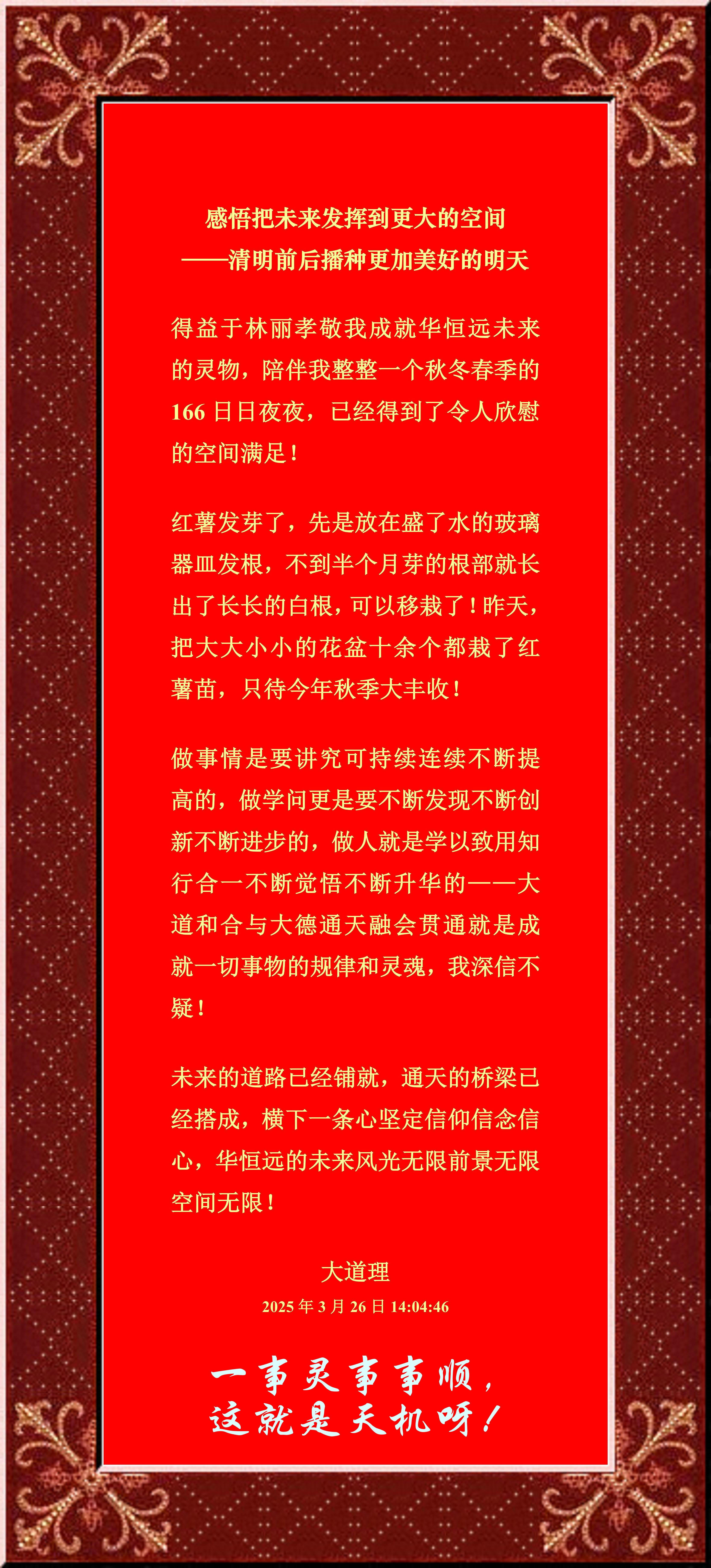 得益于林麗孝敬我成就華恒遠(yuǎn)未來的靈物,陪伴我整整一個(gè)秋冬春季的166個(gè)日日夜夜,已經(jīng)得到了令人欣慰的空間滿足!