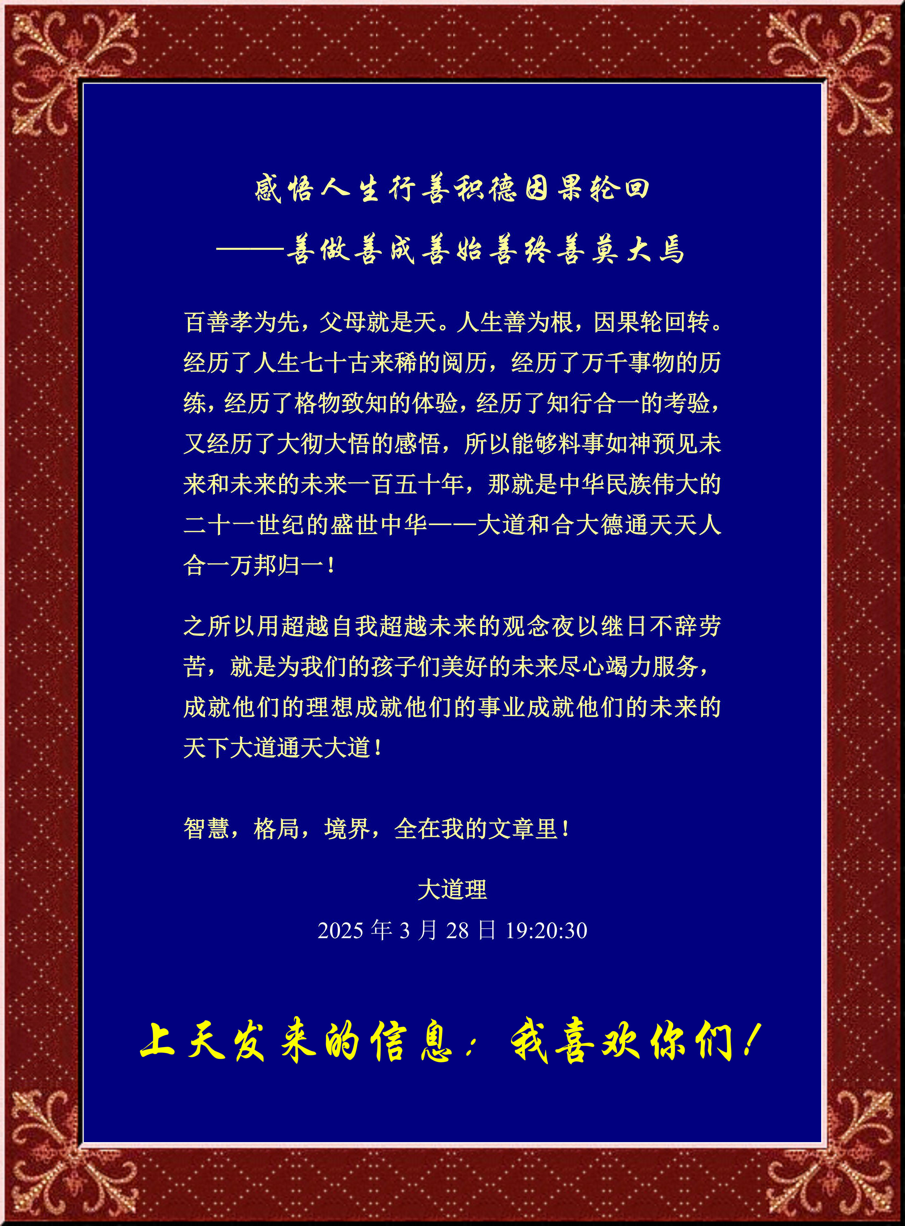 經(jīng)歷了人生七十古來稀的閱歷,經(jīng)歷了萬千事物的歷練,經(jīng)歷了格物致知的體驗,經(jīng)歷了知行合一的考驗,又經(jīng)歷了大徹大悟的感悟,所以能夠料事如神預(yù)見未來和未來的未來一百五十年,那就是中華民族偉大的二十一世紀(jì)的盛世中華——大道和合大德通天天人合一萬邦歸一!