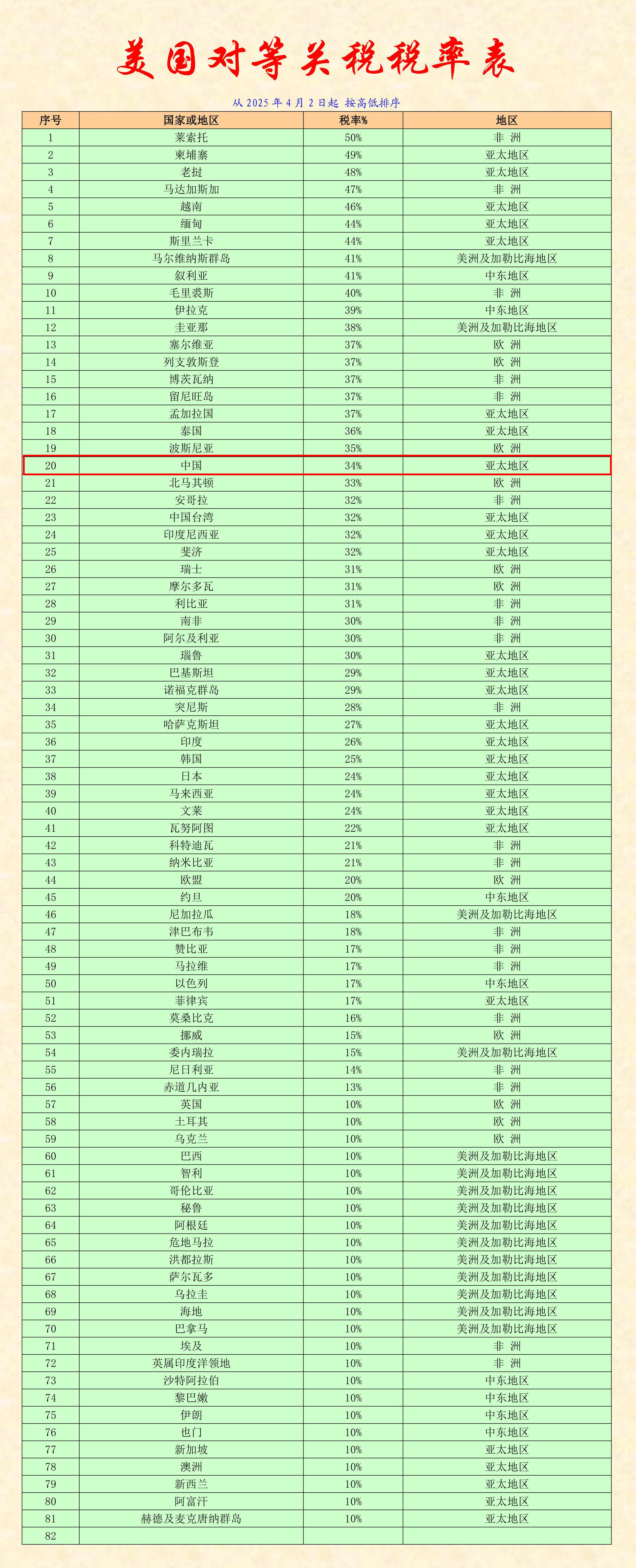 特朗普當日下午在白宮玫瑰園舉行「讓美國再次富?!够顒?,將當天形容為美國的「解放日」。按照行政命令,美國對所有進口美國商品加征10%的基準關稅,預計美東時間周六凌晨生效。至于針對部分國家征收的較高額關稅稅率,則于下周二凌晨生效。