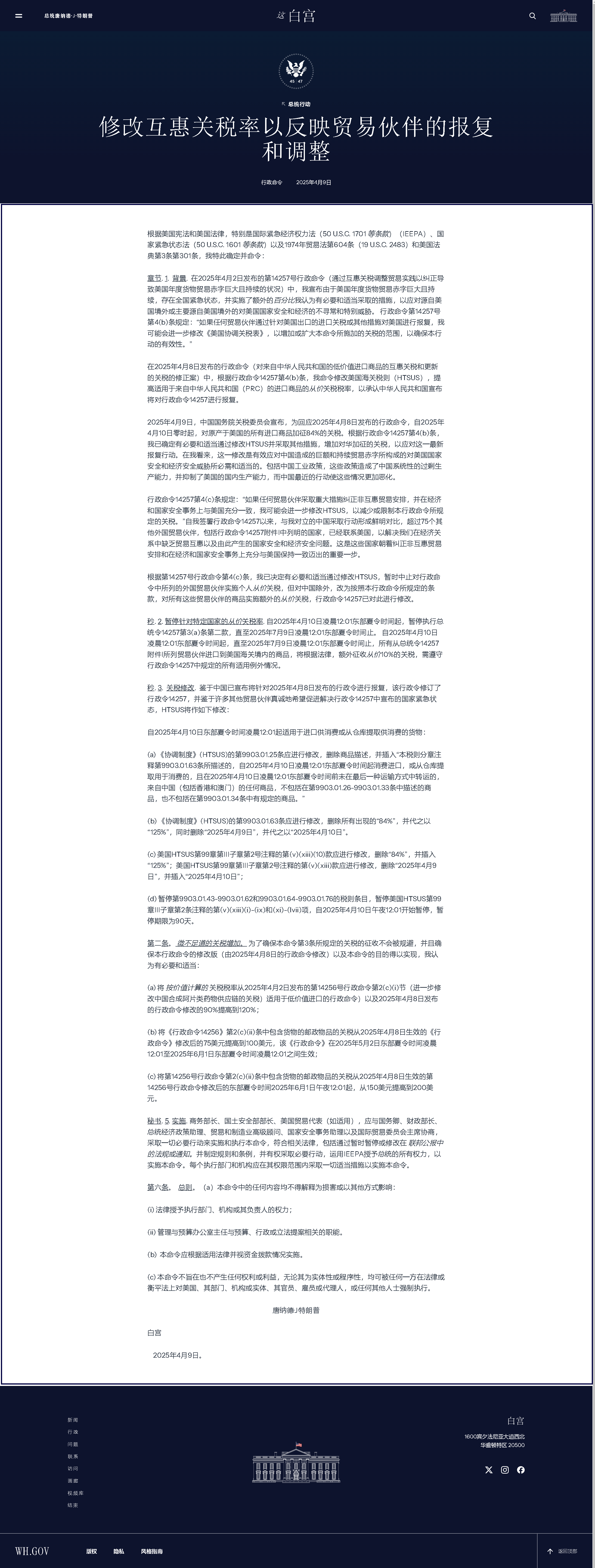 章節(jié). 1. 背景. 在2025年4月2日發(fā)布的第14257號行政命令(通過互惠關(guān)稅調(diào)整貿(mào)易實踐以糾正導(dǎo)致美國年度貨物貿(mào)易赤字巨大且持續(xù)的狀況)中,我宣布由于美國年度貨物貿(mào)易赤字巨大且持續(xù),存在全國緊急狀態(tài),并實施了額外的百分比我認為有必要和適當采取的措施,以應(yīng)對源自美國境外或主要源自美國境外的對美國國家安全和經(jīng)濟的不尋常和特別威脅。 行政命令第14257號第4(b)條規(guī)定:“如果任何貿(mào)易伙伴通過針對美國出口的進口關(guān)稅或其他措施對美國進行報復(fù),我可能會進一步修改《美國協(xié)調(diào)關(guān)稅表》,以增加或擴大本命令所施加的關(guān)稅的范圍,以確保本行動的有效性。”
