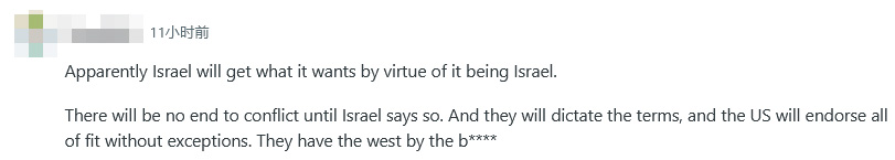 還有人指出,美國(guó)在中東地區(qū)的沖突中過(guò)于偏袒以色列,“顯然,以色列能得到它想要的,因?yàn)樗且陨?。在以色列說(shuō)出來(lái)之前,沖突不會(huì)結(jié)束,他們將決定條款,而美國(guó)將毫無(wú)例外地支持所有條件?!?