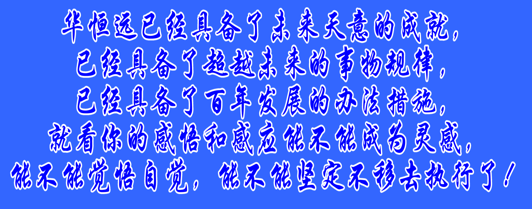 華恒遠已經具備了未來天意的成就,已經具備了超越未來的事物規(guī)律,已經具備了百年發(fā)展的辦法措施,就看你的感悟和感應能不能成為靈感,能不能覺悟自覺,能不能堅定不移去執(zhí)行了!