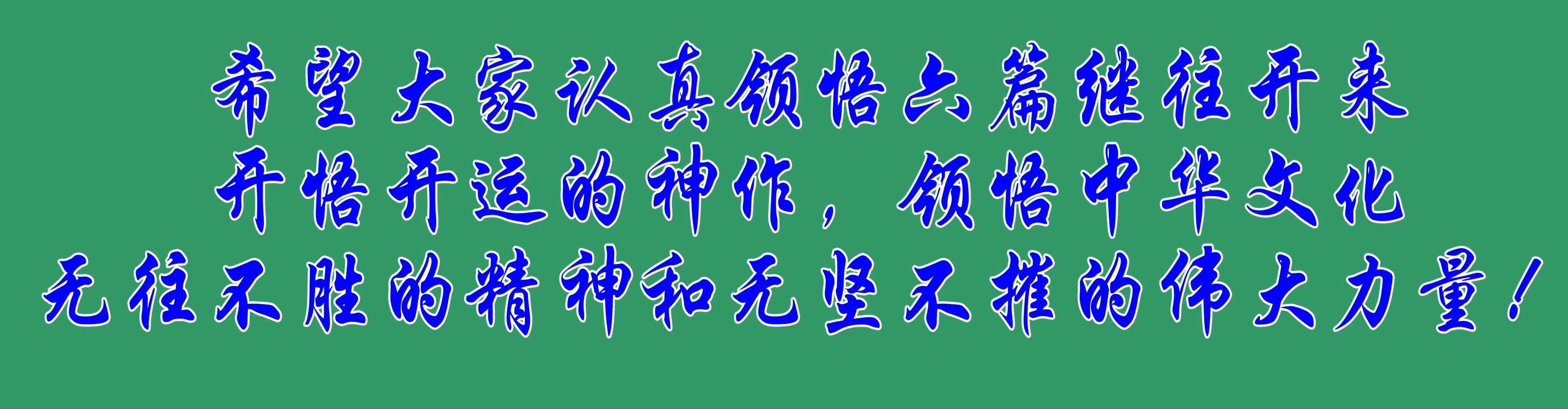希望大家認(rèn)真領(lǐng)悟六篇繼往開來(lái)開悟開運(yùn)的神作,領(lǐng)悟中華文化無(wú)往不勝的精神和無(wú)堅(jiān)不摧的偉大力量!
