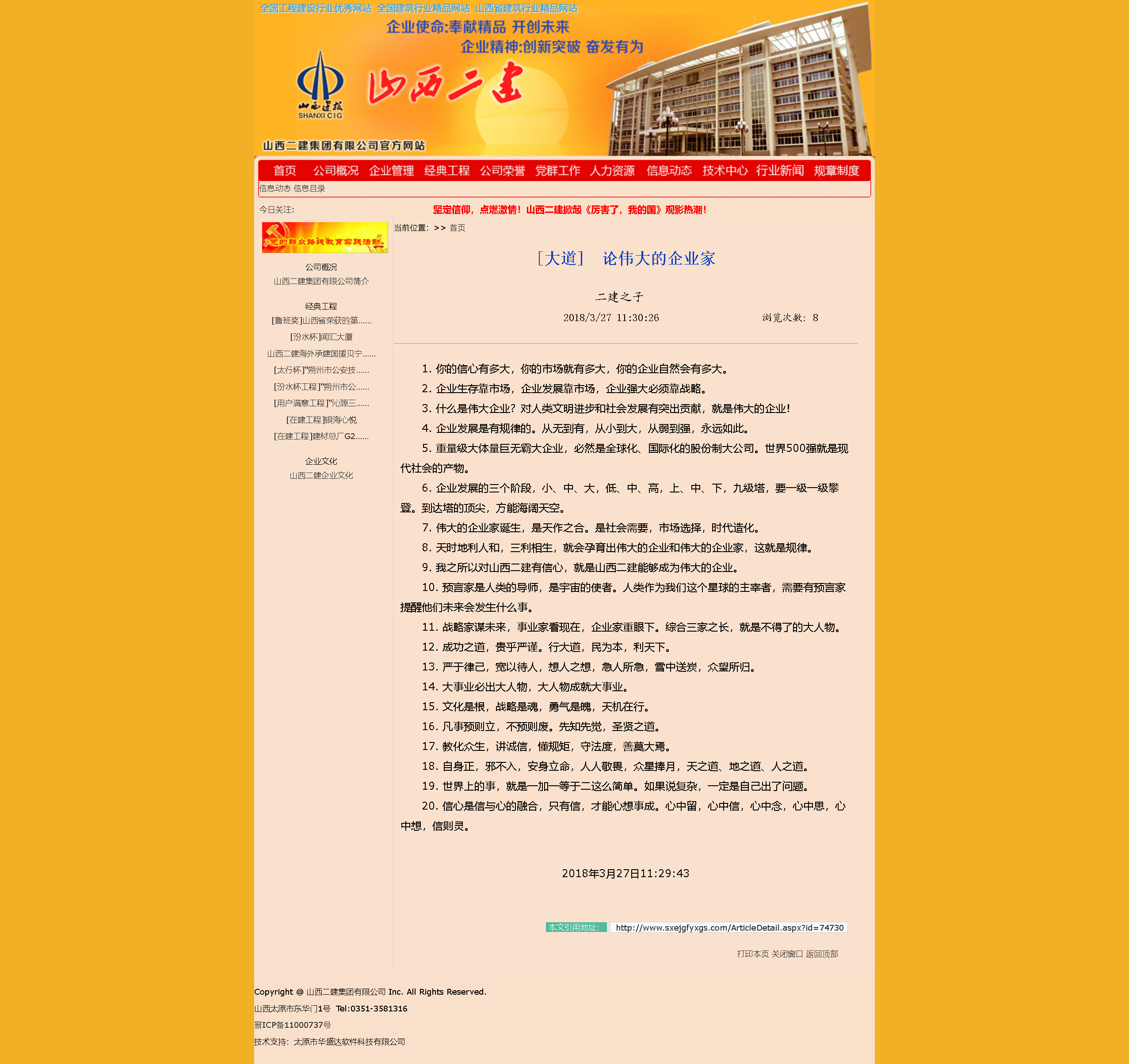 一個偉大事業(yè)的成功,必然出現(xiàn)偉大的人物,這是人類歷史的規(guī)律??梢灶A(yù)見,山西二建未來,一定會有這樣的統(tǒng)帥出現(xiàn),讓我們拭目以待!