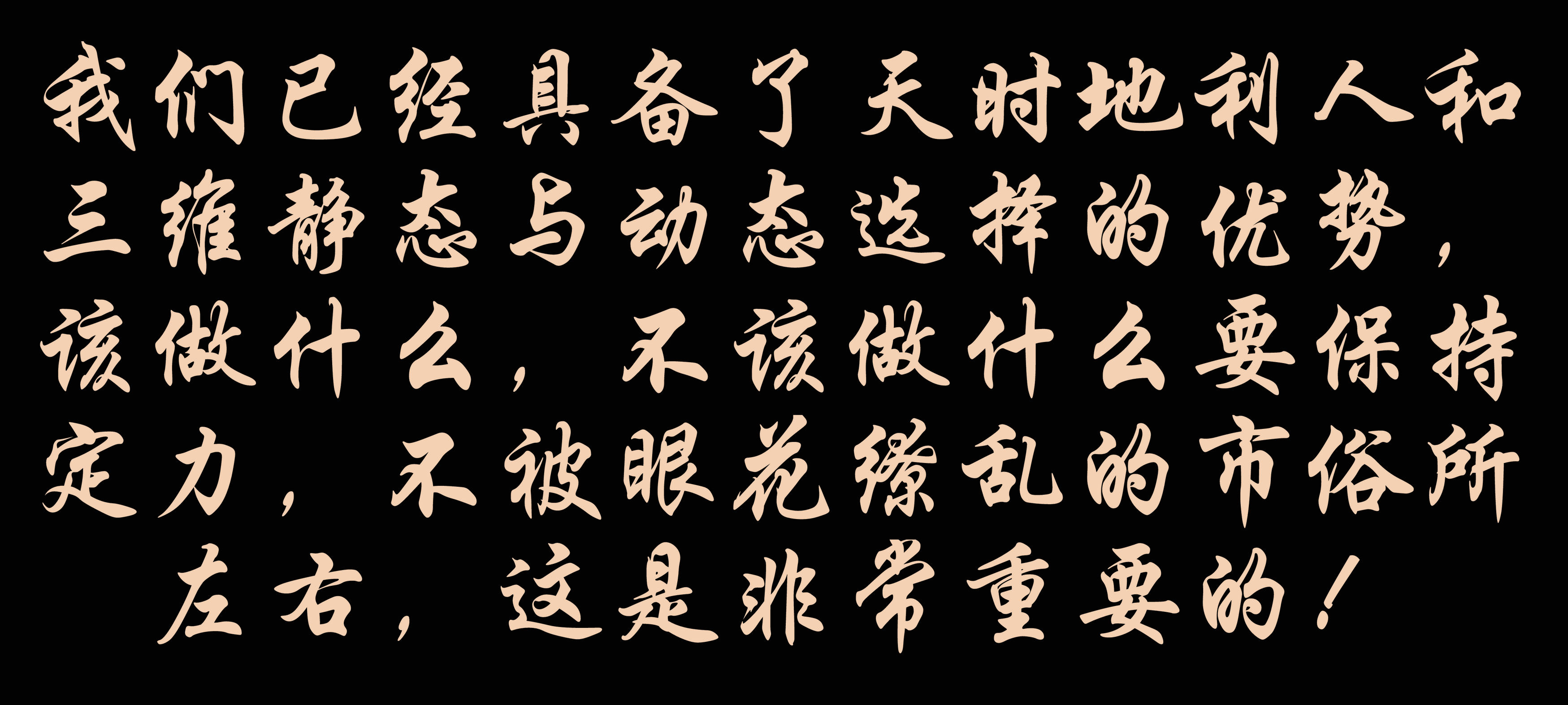 我們已經(jīng)具備了天時(shí)地利人和三維靜態(tài)與動(dòng)態(tài)選擇的優(yōu)勢(shì),該做什么,不該做什么要保持定力,不被眼花繚亂的市俗所左右,這是非常重要的!上天和大自然總是考驗(yàn)每一個(gè)人的智慧,看看你能不能勝任交給你的使命和擔(dān)當(dāng)!這不是捉弄人嗎?是的,就是用這樣的方式,這樣的辦法看著你!