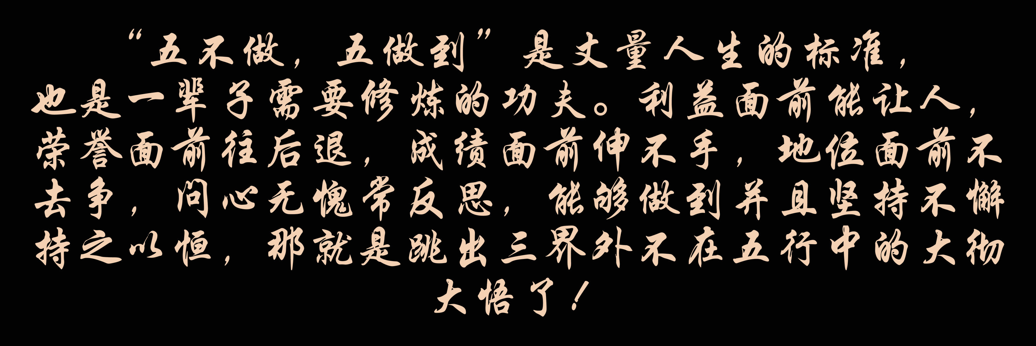 “五不做,五做到”,是丈量人生的標(biāo)準(zhǔn),也是一輩子需要修煉的功夫。利益面前能讓人,榮譽(yù)面前往后退,成績(jī)面前不伸手,地位面前不去爭(zhēng),問(wèn)心無(wú)愧常反思,能夠做到并且堅(jiān)持不懈持之以恒,那就是跳出三界外不在五行中的大徹大悟了!